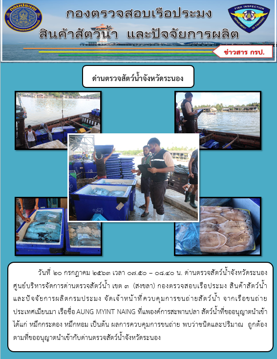 วันที่ 20 กรกฎาคม 2563 เวลา 07.50 – 08.40 น. ด่านตรวจสัตว์น้ำจังหวัดระนอง ศูนย์บริหารจัดการด่านตรวจสัตว์น้ำ เขต 3 (สงขลา) กองตรวจสอบเรือประมง สินค้าสัตว์น้ำ และปัจจัยการผลิตกรมประมง จัดเจ้าหน้าที่ควบคุมการขนถ่ายสัตว์น้ำ จากเรือขนถ่าย ประเทศเมียนมา เรือชื่อ AUNG MYINT NAING ที่แพองค์การสะพานปลา สัตว์น้ำที่ขออนุญาตนำเข้า ได้แก่ หมึกกระดอง หมึกหอม เป็นต้น ผลการควบคุมการขนถ่าย พบว่าชนิดและปริมาณ ถูกต้องตามที่ขออนุญาตนำเข้ากับด่านตรวจสัตว์น้ำจังหวัดระนอง