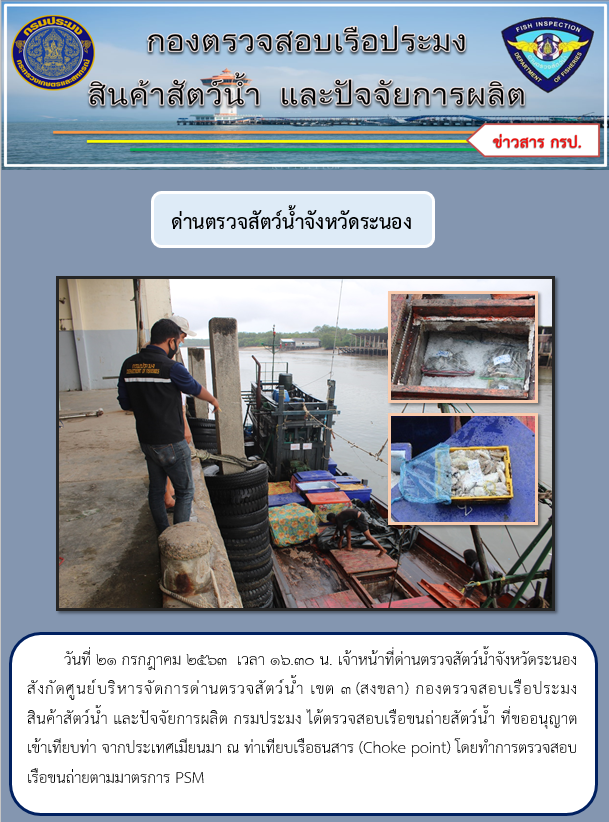วันที่ 21 กรกฎาคม 2563 เวลา 16.30 น. เจ้าหน้าที่ด่านตรวจสัตว์น้ำจังหวัดระนอง สังกัดศูนย์บริหารจัดการด่านตรวจสัตว์น้ำ เขต 3 (สงขลา) กองตรวจสอบเรือประมง สินค้าสัตว์น้ำ และปัจจัยการผลิต กรมประมง ได้ตรวจสอบเรือขนถ่ายสัตว์น้ำ ที่ขออนุญาตเข้าเทียบท่า จากประเทศเมียนมา ณ ท่าเทียบเรือธนสาร (Choke point) โดยทำการตรวจสอบเรือขนถ่ายตามมาตรการ PSM
