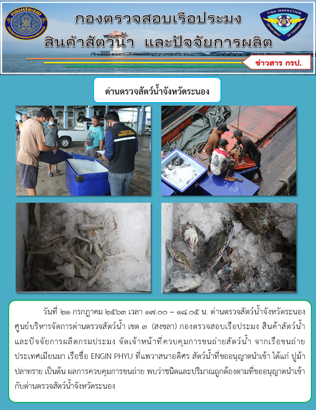วันที่ 21 กรกฎาคม 2563 เวลา 17.00 – 18.05 น. ด่านตรวจสัตว์น้ำจังหวัดระนอง ศูนย์บริหารจัดการด่านตรวจสัตว์น้ำ เขต 3  (สงขลา) กองตรวจสอบเรือประมง สินค้าสัตว์น้ำและปัจจัยการผลิตกรมประมง จัดเจ้าหน้าที่ควบคุมการขนถ่ายสัตว์น้ำ จากเรือขนถ่าย  ประเทศเมียนมา เรือชื่อ ENGIN PHYU ที่แพวาสนาอดิศร สัตว์น้ำที่ขออนุญาตนำเข้า ได้แก่ ปูม้า ปลาทราย เป็นต้น ผลการควบคุมการขนถ่าย พบว่าชนิดและปริมาณถูกต้องตามที่ขออนุญาตนำเข้ากับด่านตรวจสัตว์น้ำจังหวัดระนอง