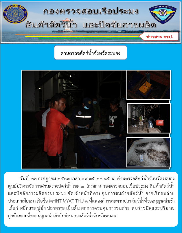 วันที่ 23 กรกฎาคม 2563 เวลา 19.35-20.15 น. ด่านตรวจสัตว์น้ำจังหวัดระนองศูนย์บริหารจัดการด่านตรวจสัตว์น้ำ เขต 3 (สงขลา) กองตรวจสอบเรือประมง สินค้าสัตว์น้ำ และปัจจัยการผลิตกรมประมง จัดเจ้าหน้าที่ควบคุมการขนถ่ายสัตว์น้ำ จากเรือขนถ่าย ประเทศเมียนมา เรือชื่อ MYINT MYAT THU-7 ที่แพองค์การสะพานปลา สัตว์น้ำที่ขออนุญาตนำเข้า ได้แก่ หมึกสาย ปูม้า ปลาทราย เป็นต้น ผลการควบคุมการขนถ่าย พบว่าชนิดและปริมาณ ถูกต้องตามที่ขออนุญาตนำเข้ากับด่านตรวจสัตว์น้ำจังหวัดระนอง
