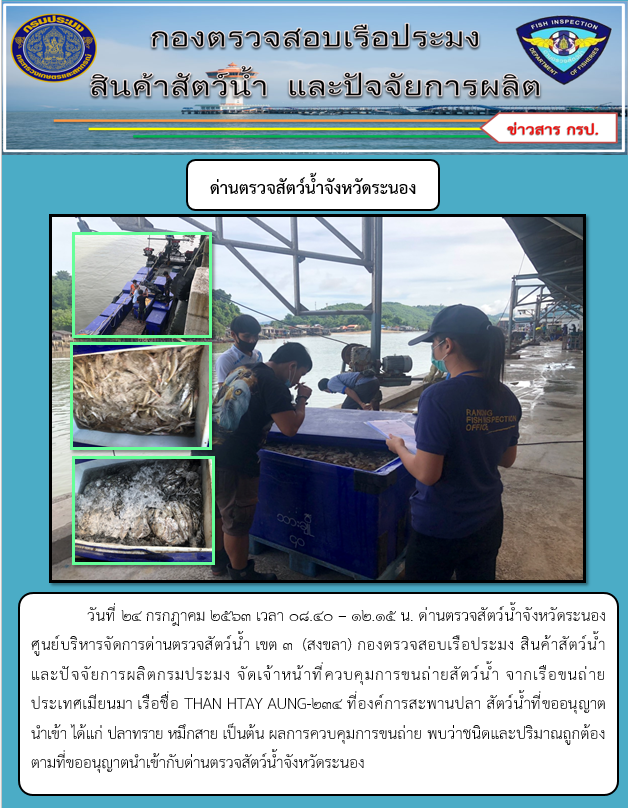 วันที่ 24 กรกฎาคม 2563 เวลา 08.40 – 12.15 น. ด่านตรวจสัตว์น้ำจังหวัดระนอง ศูนย์บริหารจัดการด่านตรวจสัตว์น้ำ เขต 3 (สงขลา) กองตรวจสอบเรือประมง สินค้าสัตว์น้ำและปัจจัยการผลิตกรมประมง จัดเจ้าหน้าที่ควบคุมการขนถ่ายสัตว์น้ำ จากเรือขนถ่าย ประเทศเมียนมา เรือชื่อ THAN HTAY AUNG-234 ที่องค์การสะพานปลา สัตว์น้ำที่ขออนุญาตนำเข้า ได้แก่ ปลาทราย หมึกสาย เป็นต้น ผลการควบคุมการขนถ่าย พบว่าชนิดและปริมาณถูกต้องตามที่ขออนุญาตนำเข้ากับด่านตรวจสัตว์น้ำจังหวัดระนองวันที่ 24 กรกฎาคม 2563 เวลา 08.40 – 12.15 น. ด่านตรวจสัตว์น้ำจังหวัดระนอง ศูนย์บริหารจัดการด่านตรวจสัตว์น้ำ เขต 3 (สงขลา) กองตรวจสอบเรือประมง สินค้าสัตว์น้ำและปัจจัยการผลิตกรมประมง จัดเจ้าหน้าที่ควบคุมการขนถ่ายสัตว์น้ำ จากเรือขนถ่าย ประเทศเมียนมา เรือชื่อ THAN HTAY AUNG-234 ที่องค์การสะพานปลา สัตว์น้ำที่ขออนุญาตนำเข้า ได้แก่ ปลาทราย หมึกสาย เป็นต้น ผลการควบคุมการขนถ่าย พบว่าชนิดและปริมาณถูกต้องตามที่ขออนุญาตนำเข้ากับด่านตรวจสัตว์น้ำจังหวัดระนอง
