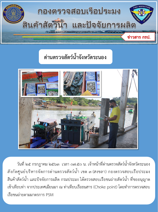 วันที่ 25 กรกฎาคม 2563 เวลา 07.50 น. เจ้าหน้าที่ด่านตรวจสัตว์น้ำจังหวัดระนอง สังกัดศูนย์บริหารจัดการด่านตรวจสัตว์น้ำ เขต 3 (สงขลา) กองตรวจสอบเรือประมง สินค้าสัตว์น้ำ และปัจจัยการผลิต กรมประมง ได้ตรวจสอบเรือขนถ่ายสัตว์น้ำ ที่ขออนุญาต เข้าเทียบท่า จากประเทศเมียนมา ณ ท่าเทียบเรือธนสาร (Choke point) โดยทำการตรวจสอบเรือขนถ่ายตามมาตรการ PSM
