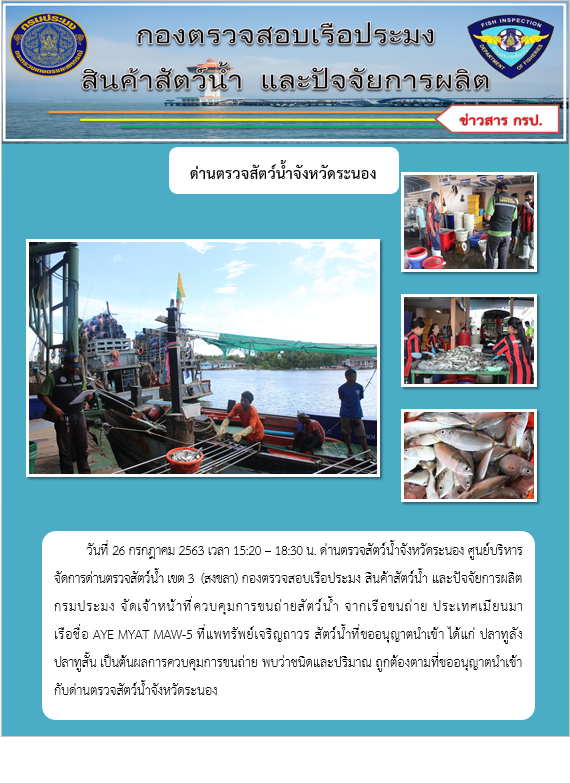 วันที่ 26 กรกฎาคม 2563 เวลา 15:20 – 18:30 น. ด่านตรวจสัตว์น้ำจังหวัดระนอง ศูนย์บริหารจัดการด่านตรวจสัตว์น้ำ เขต 3 (สงขลา) กองตรวจสอบเรือประมง สินค้าสัตว์น้ำ และปัจจัยการผลิตกรมประมง จัดเจ้าหน้าที่ควบคุมการขนถ่ายสัตว์น้ำ จากเรือขนถ่าย ประเทศเมียนมา เรือชื่อ AYE MYAT MAW-5 ที่แพทรัพย์เจริญถาวร สัตว์น้ำที่ขออนุญาตนำเข้า ได้แก่ ปลาทูลัง ปลาทูสั้น เป็นต้นผลการควบคุมการขนถ่าย พบว่าชนิดและปริมาณ ถูกต้องตามที่ขออนุญาตนำเข้ากับด่านตรวจสัตว์น้ำจังหวัดระนอง