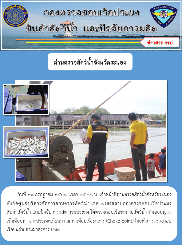 วันที่ 28 กรกฎาคม 2563 เวลา 15.00 น. เจ้าหน้าที่ด่านตรวจสัตว์น้ำจังหวัดระนอง สังกัดศูนย์บริหารจัดการด่านตรวจสัตว์น้ำ เขต 3 (สงขลา) กองตรวจสอบเรือประมง สินค้าสัตว์น้ำ และปัจจัยการผลิต กรมประมง ได้ตรวจสอบเรือขนถ่ายสัตว์น้ำ ที่ขออนุญาต เข้าเทียบท่า จากประเทศเมียนมา ณ ท่าเทียบเรือธนสาร (Choke point) โดยทำการตรวจสอบเรือขนถ่ายตามมาตรการ PSM