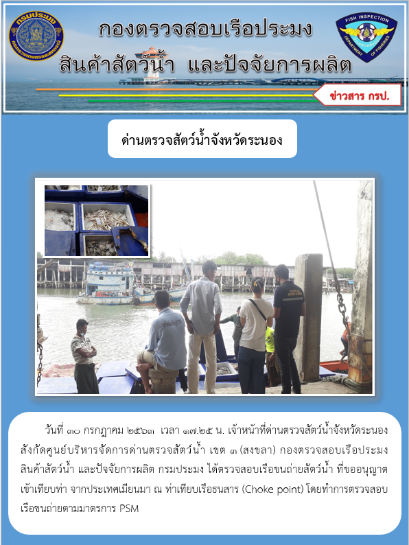 วันที่ 30 กรกฎาคม 2563 เวลา 17.25 น. เจ้าหน้าที่ด่านตรวจสัตว์น้ำจังหวัดระนอง สังกัดศูนย์บริหารจัดการด่านตรวจสัตว์น้ำ เขต 3 (สงขลา) กองตรวจสอบเรือประมง สินค้าสัตว์น้ำ และปัจจัยการผลิต กรมประมง ได้ตรวจสอบเรือขนถ่ายสัตว์น้ำ ที่ขออนุญาต เข้าเทียบท่า จากประเทศเมียนมา ณ ท่าเทียบเรือธนสาร (Choke point) โดยทำการตรวจสอบเรือขนถ่ายตามมาตรการ PSM