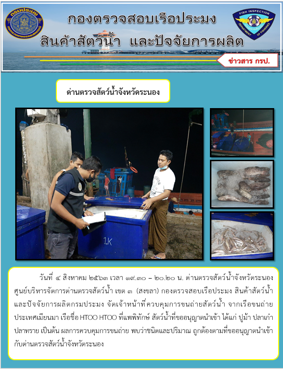 วันที่ 4 สิงหาคม 2563 เวลา 19.30 – 20.20 น. ด่านตรวจสัตว์น้ำจังหวัดระนอง ศูนย์บริหารจัดการด่านตรวจสัตว์น้ำ เขต 3 (สงขลา) กองตรวจสอบเรือประมง สินค้าสัตว์น้ำและปัจจัยการผลิตกรมประมง จัดเจ้าหน้าที่ควบคุมการขนถ่ายสัตว์น้ำ จากเรือขนถ่ายประเทศเมียนมา เรือชื่อ HTOO HTOO ที่แพพิทักษ์ สัตว์น้ำที่ขออนุญาตนำเข้า ได้แก่ ปูม้า ปลาเก๋า ปลาทราย เป็นต้น ผลการควบคุมการขนถ่าย พบว่าชนิดและปริมาณ ถูกต้องตามที่ขออนุญาตนำเข้ากับด่านตรวจสัตว์น้ำจังหวัดระนอง