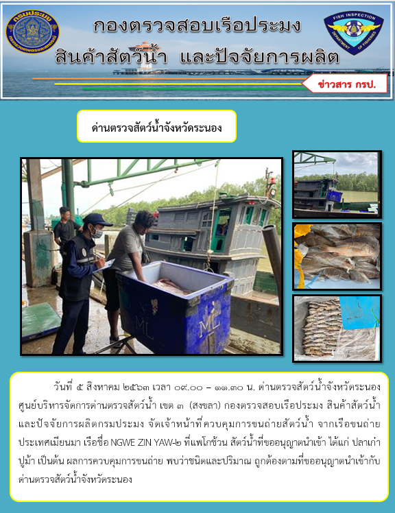 วันที่ 5 สิงหาคม 2563 เวลา 09.00 – 11.30 น. ด่านตรวจสัตว์น้ำจังหวัดระนอง ศูนย์บริหารจัดการด่านตรวจสัตว์น้ำ เขต 3 (สงขลา) กองตรวจสอบเรือประมง สินค้าสัตว์น้ำและปัจจัยการผลิตกรมประมง จัดเจ้าหน้าที่ควบคุมการขนถ่ายสัตว์น้ำ จากเรือขนถ่ายประเทศเมียนมา เรือชื่อ NGWE ZIN YAW-2 ที่แพโกช้วน สัตว์น้ำที่ขออนุญาตนำเข้า ได้แก่ ปลาเก๋า ปูม้า เป็นต้น ผลการควบคุมการขนถ่าย พบว่าชนิดและปริมาณ ถูกต้องตามที่ขออนุญาตนำเข้ากับด่านตรวจสัตว์น้ำจังหวัดระนอง