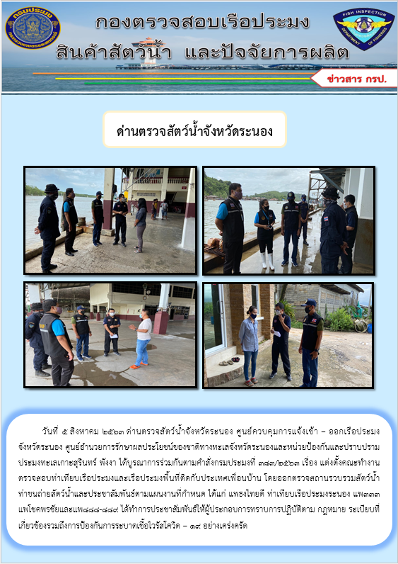 วันที่ 5 สิงหาคม 2563 ด่านตรวจสัตว์น้ำจังหวัดระนอง ศูนย์ควบคุมการแจ้งเข้า – ออกเรือประมง จังหวัดระนอง ศูนย์อำนวยการรักษาผลประโยชน์ของชาติทางทะเลจังหวัดระนองและหน่วยป้องกันและปราบปรามประมงทะเลเกาะสุรินทร์ พังงา ได้บูรณาการร่วมกันตามคำสั่งกรมประมงที่ 383/2563 เรื่อง แต่งตั้งคณะทำงานตรวจสอบท่าเทียบเรือประมงและเรือประมงพื้นที่ติดกับประเทศเพื่อนบ้าน โดยออกตรวจสถานรวบรวมสัตว์น้ำ ท่าขนถ่ายสัตว์น้ำและประชาสัมพันธ์ตามแผนงานที่กำหนด ได้แก่ แพธงไทยดี ท่าเทียบเรือประมงระนอง แพ333 แพโชคพรชัยและแพ888-889 ได้ทำการประชาสัมพันธ์ให้ผู้ประกอบการทราบการปฏิบัติตาม กฎหมาย ระเบียบที่เกี่ยวข้องรวมถึงการป้องกันการระบาดเชื้อไวรัสโควิด – 19 อย่างเคร่งครัด