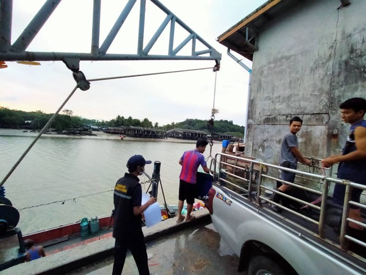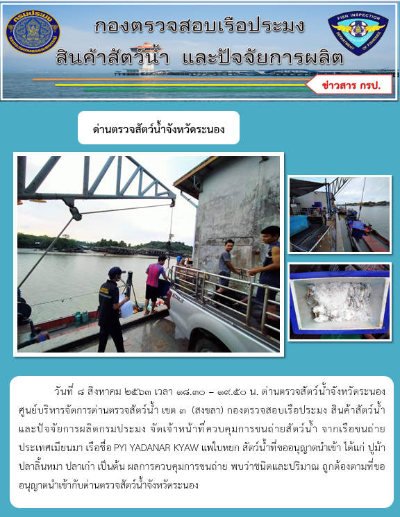 วันที่ 8 สิงหาคม 2563 เวลา 18.30 – 19.50 น. ด่านตรวจสัตว์น้ำจังหวัดระนอง ศูนย์บริหารจัดการด่านตรวจสัตว์น้ำ เขต 3 (สงขลา) กองตรวจสอบเรือประมง สินค้าสัตว์น้ำและปัจจัยการผลิตกรมประมง จัดเจ้าหน้าที่ควบคุมการขนถ่ายสัตว์น้ำจากเรือขนถ่ายประเทศเมียนมา เรือชื่อ PYI YADANAR KYAW แพใบหยก สัตว์น้ำที่ขออนุญาตนำเข้า ได้แก่ ปูม้า ปลาลิ้นหมา ปลาเก๋า เป็นต้น ผลการควบคุมการขนถ่าย พบว่าชนิดและปริมาณ ถูกต้องตามที่ขออนุญาตนำเข้ากับด่านตรวจสัตว์น้ำจังหวัดระนอง