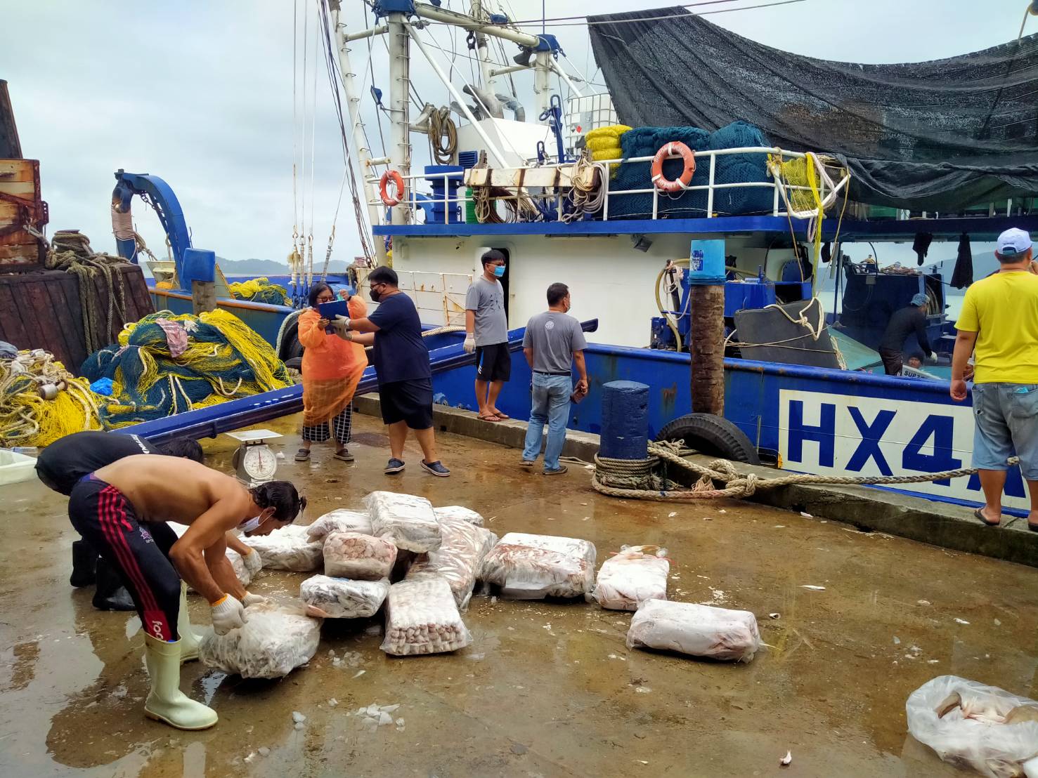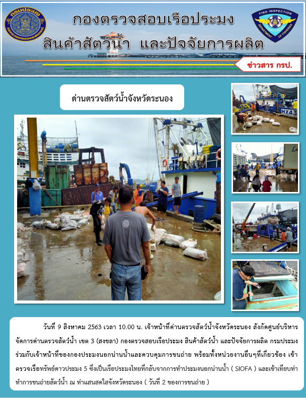 วันที่ 9 สิงหาคม 2563 เวลา 10.00 น. เจ้าหน้าที่ด่านตรวจสัตว์น้ำจังหวัดระนอง สังกัดศูนย์บริหารจัดการด่านตรวจสัตว์น้ำ เขต 3 (สงขลา) กองตรวจสอบเรือประมง สินค้าสัตว์น้ำ และปัจจัยการผลิต กรมประมง ร่วมกับเจ้าหน้าที่ของกองประมงนอกน่านน้ำและควบคุมการขนถ่าย พร้อมทั้งหน่วยงานอื่นๆที่เกี่ยวข้อง เข้าตรวจเรือทรัพย์ดาวประมง 5 ซึ่งเป็นเรือประมงไทยที่กลับจากการทำประมงนอกน่านน้ำ ( SIOFA ) และเข้าเทียบท่าทำการขนถ่ายสัตว์น้ำ ณ ท่าแสนสดใสจังหวัดระนอง ( วันที่ 2 ของการขนถ่าย )