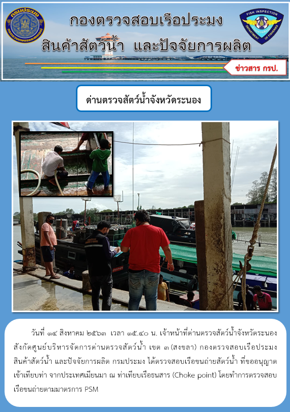 วันที่ 14 สิงหาคม 2563 เวลา 15.40 น. เจ้าหน้าที่ด่านตรวจสัตว์น้ำจังหวัดระนอง สังกัดศูนย์บริหารจัดการด่านตรวจสัตว์น้ำ เขต 3 (สงขลา) กองตรวจสอบเรือประมง สินค้าสัตว์น้ำ และปัจจัยการผลิต กรมประมง ได้ตรวจสอบเรือขนถ่ายสัตว์น้ำ ที่ขออนุญาตเข้าเทียบท่า จากประเทศเมียนมา ณ ท่าเทียบเรือธนสาร (Choke point) โดยทำการตรวจสอบเรือขนถ่ายตามมาตรการ PSM