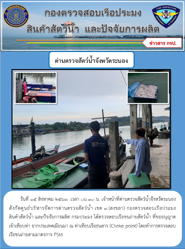 วันที่ 15 สิงหาคม 2563 เวลา 06.30 น. เจ้าหน้าที่ด่านตรวจสัตว์น้ำจังหวัดระนอง สังกัดศูนย์บริหารจัดการด่านตรวจสัตว์น้ำ เขต 3 (สงขลา) กองตรวจสอบเรือประมง สินค้าสัตว์น้ำ และปัจจัยการผลิต กรมประมง ได้ตรวจสอบเรือขนถ่ายสัตว์น้ำ ที่ขออนุญาต ข้าเทียบท่า จากประเทศเมียนมา ณ ท่าเทียบเรือธนสาร (Choke point) โดยทำการตรวจสอบเรือขนถ่ายตามมาตรการ PSM