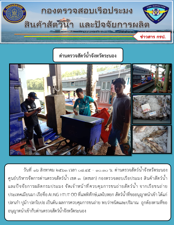 วันที่ 16 สิงหาคม 2563 เวลา 08.45 – 10.30 น. ด่านตรวจสัตว์น้ำจังหวัดระนอง ศูนย์บริหารจัดการด่านตรวจสัตว์น้ำ เขต 3 (สงขลา) กองตรวจสอบเรือประมง สินค้าสัตว์น้ำ และปัจจัยการผลิตกรมประมง จัดเจ้าหน้าที่ควบคุมการขนถ่ายสัตว์น้ำ จากเรือขนถ่าย ประเทศเมียนมา เรือชื่อ AUNG HTUT OO ที่แพพิทักษ์,แพใบหยก สัตว์น้ำที่ขออนุญาตนำเข้า ได้แก่ ปลาเก๋า ปูม้า ปลาใบปอ เป็นต้น ผลการควบคุมการขนถ่าย พบว่าชนิดและปริมาณ ถูกต้องตามที่ขออนุญาตนำเข้ากับด่านตรวจสัตว์น้ำจังหวัดระนอง