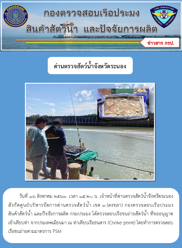 วันที่ 16 สิงหาคม 2563 เวลา 15.20 น. เจ้าหน้าที่ด่านตรวจสัตว์น้ำจังหวัดระนอง สังกัดศูนย์บริหารจัดการด่านตรวจสัตว์น้ำ เขต 3 (สงขลา) กองตรวจสอบเรือประมง สินค้าสัตว์น้ำ และปัจจัยการผลิต กรมประมง ได้ตรวจสอบเรือขนถ่ายสัตว์น้ำ ที่ขออนุญาตเข้าเทียบท่า จากประเทศเมียนมา ณ ท่าเทียบเรือธนสาร (Choke point) โดยทำการตรวจสอบเรือขนถ่ายตามมาตรการ PSM