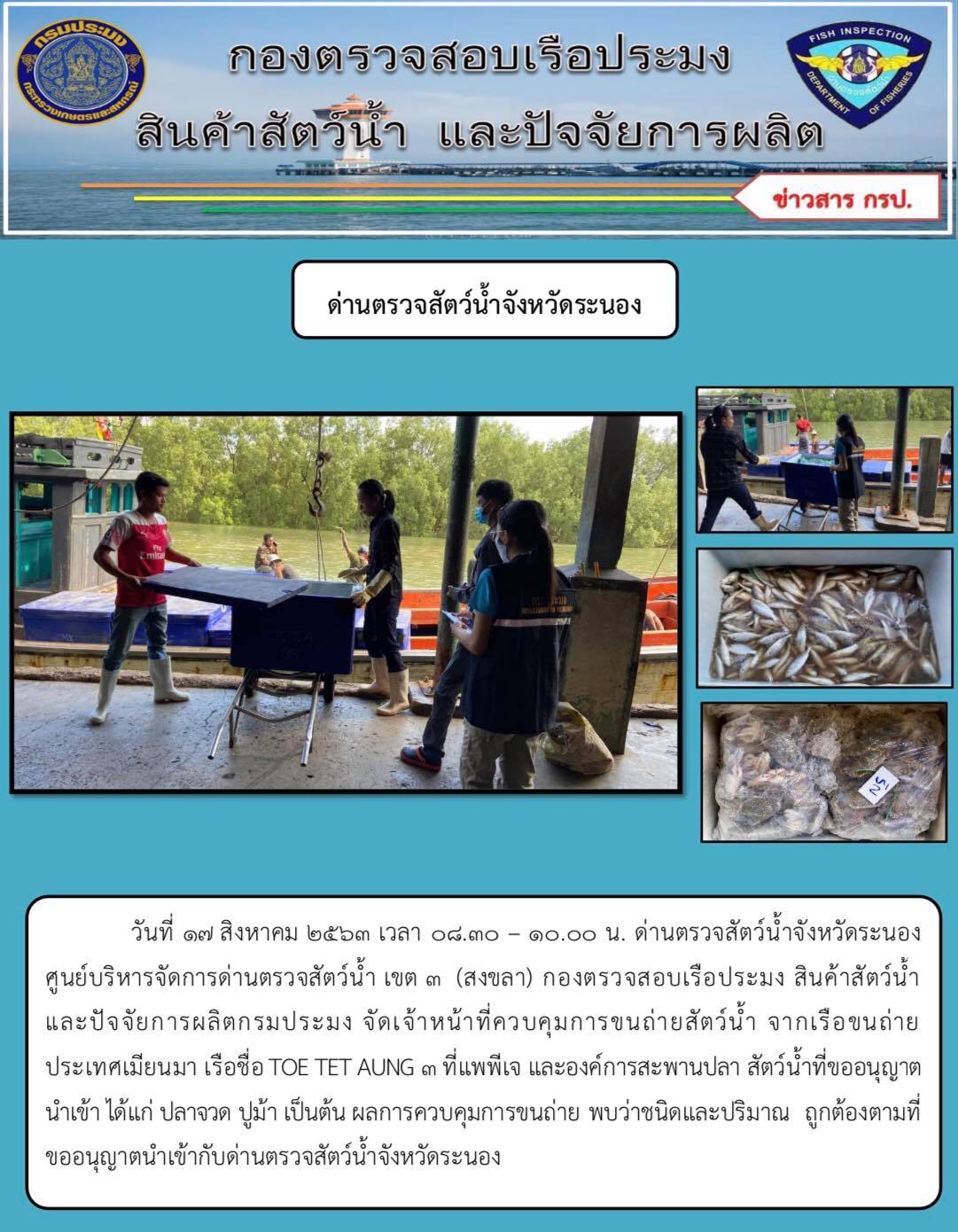วันที่ 17 สิงหาคม 2563 เวลา 08.30 – 10.00 น. ด่านตรวจสัตว์น้ำจังหวัดระนอง ศูนย์บริหารจัดการด่านตรวจสัตว์น้ำ เขต 3 (สงขลา) กองตรวจสอบเรือประมงสินค้าสัตว์น้ำ และปัจจัยการผลิตกรมประมง จัดเจ้าหน้าที่ควบคุมการขนถ่ายสัตว์น้ำ จากเรือขนถ่ายประเทศเมียนมา เรือชื่อ TOE TET AUNG 3 ที่แพพีเจ และองค์การสะพานปลา สัตว์น้ำที่ขออนุญาตนำเข้า ได้แก่ ปลาจวด ปูม้า เป็นต้น ผลการควบคุมการขนถ่าย พบว่าชนิดและปริมาณ ถูกต้องตามที่ขออนุญาตนำเข้ากับด่านตรวจสัตว์น้ำจังหวัดระนอง