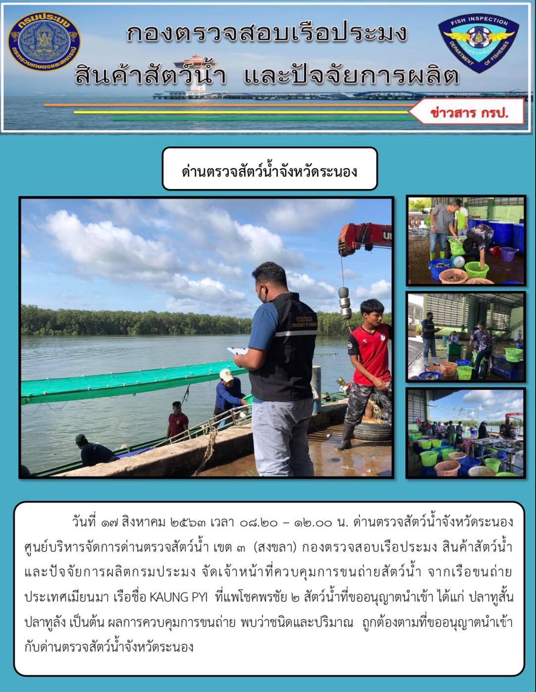 วันที่ 17 สิงหาคม 2563 เวลา 08.20 – 12.00 น. ด่านตรวจสัตว์น้ำจังหวัดระนอง ศูนย์บริหารจัดการด่านตรวจสัตว์น้ำ เขต 3 (สงขลา) กองตรวจสอบเรือประมงสินค้าสัตว์น้ำ และปัจจัยการผลิตกรมประมง จัดเจ้าหน้าที่ควบคุมการขนถ่ายสัตว์น้ำ จากเรือขนถ่ายประเทศเมียนมา เรือชื่อ KAUNG PYI ที่แพโชคพรชัย 2 สัตว์น้ำที่ขออนุญาตนำเข้า ได้แก่ ปลาทูสั้น ปลาทูลัง เป็นต้น ผลการควบคุมการขนถ่าย พบว่าชนิดและปริมาณ ถูกต้องตามที่ขออนุญาตนำเข้ากับด่านตรวจสัตว์น้ำจังหวัดระนอง