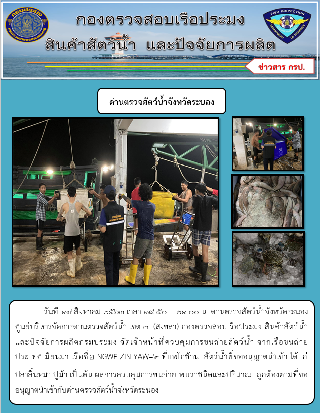 วันที่ 17 สิงหาคม 2563 เวลา 19.50 – 21.00 น. ด่านตรวจสัตว์น้ำจังหวัดระนอง ศูนย์บริหารจัดการด่านตรวจสัตว์น้ำ เขต 3 (สงขลา) กองตรวจสอบเรือประมง สินค้าสัตว์น้ำและปัจจัยการผลิตกรมประมง จัดเจ้าหน้าที่ควบคุมการขนถ่ายสัตว์น้ำ จากเรือขนถ่ายประเทศเมียนมา เรือชื่อ NGWE ZIN YAW-2 ที่แพโกช้วน สัตว์น้ำที่ขออนุญาตนำเข้า ได้แก่ ปลาลิ้นหมา ปูม้า เป็นต้น ผลการควบคุมการขนถ่าย พบว่าชนิดและปริมาณ ถูกต้องตามที่ขออนุญาตนำเข้ากับด่านตรวจสัตว์น้ำจังหวัดระนอง