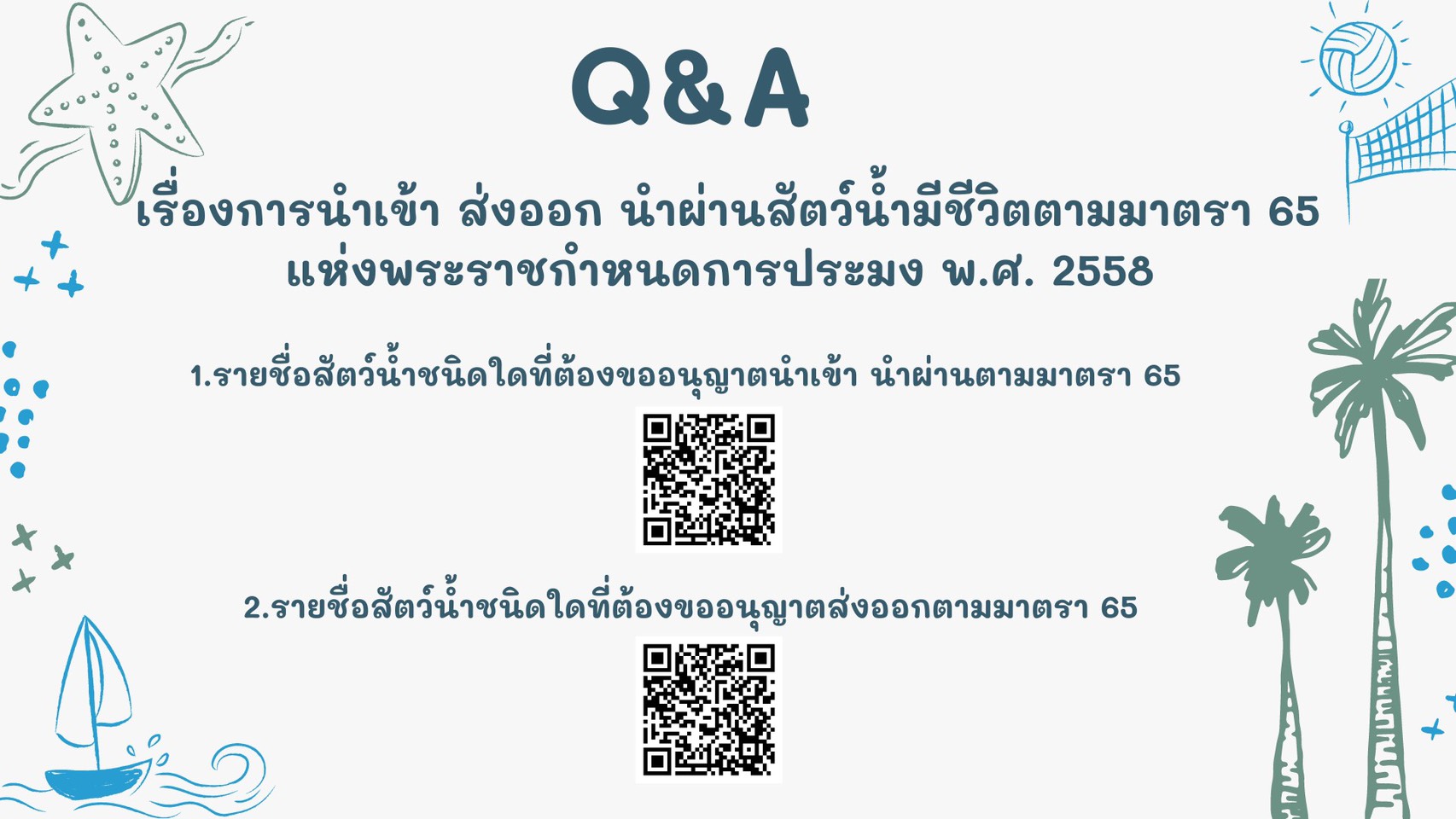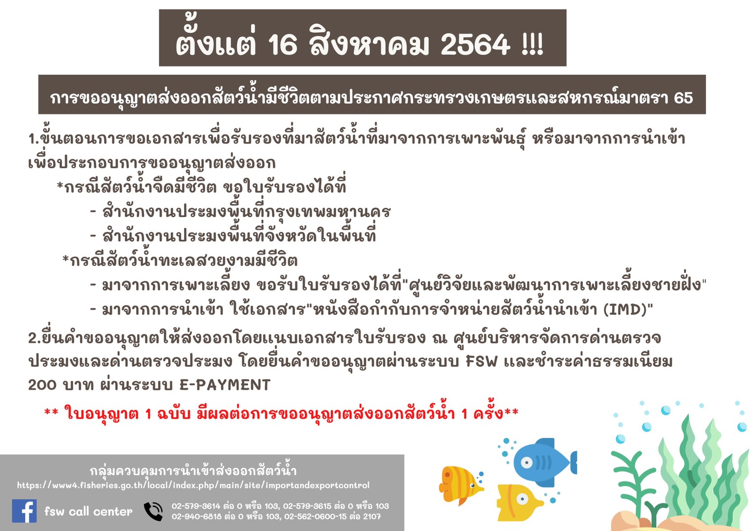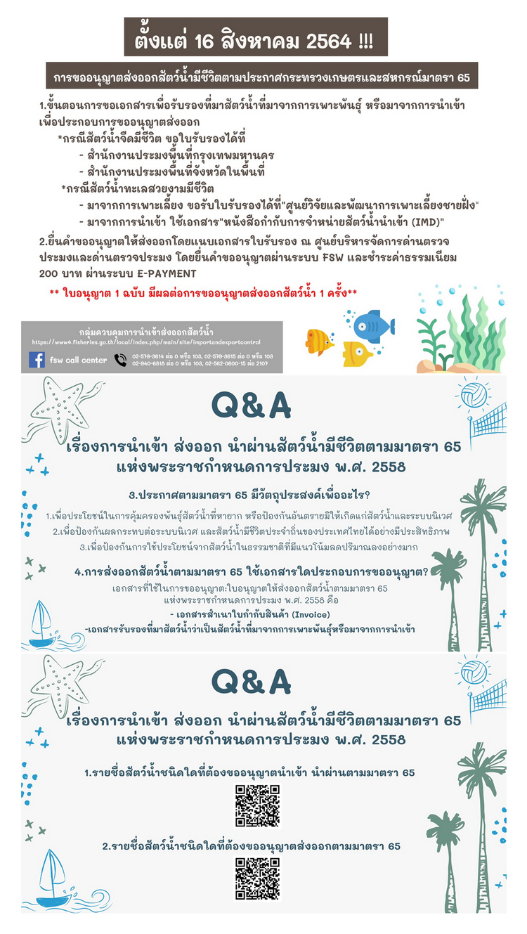การนำเข้า ส่งออก นำผ่านสัตว์น้ำมีชีวิตตามมาตรา 65 แห่งพระราชกำหนดการประมง พ.ศ.2558..คลิก