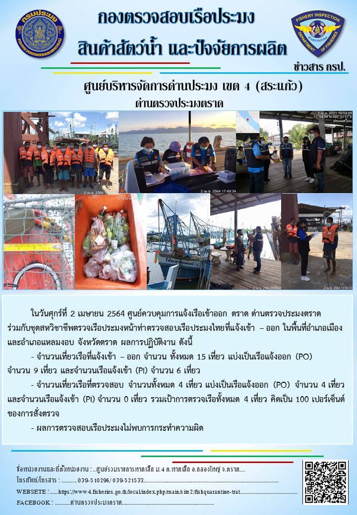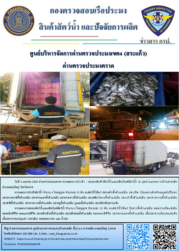 วันที่ 2 เมษายน 2564 ด่านตรวจประมงตราด  ตรวจสอบการนำเข้า – ส่งออกสินค้าสัตว์น้ำและผลิตภัณฑ์สัตว์น้ำ ณ จุดผ่านแดนถาวรบ้านหาดเล็ก  อำเภอคลองใหญ่ จังหวัดตราด และ ตรวจสอบเรือประมงไทย ที่แจ้งเข้า - ออกผ่านระบบ Fishing info2 ร่วมกับชุดสหวิชาชีพ กรมเจ้าท่า กรมจัดหางาน กรมสวัสดิการ และคุ้มครองแผนงาน และล่ามภาษากัมพูชา เขตพื้นที่อำเภอคลองใหญ่ อำเภอเมืองและอำเภอแหลมงอบ จังหวัดตราด..คลิก