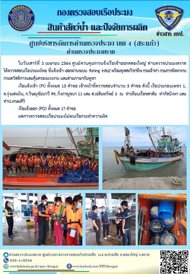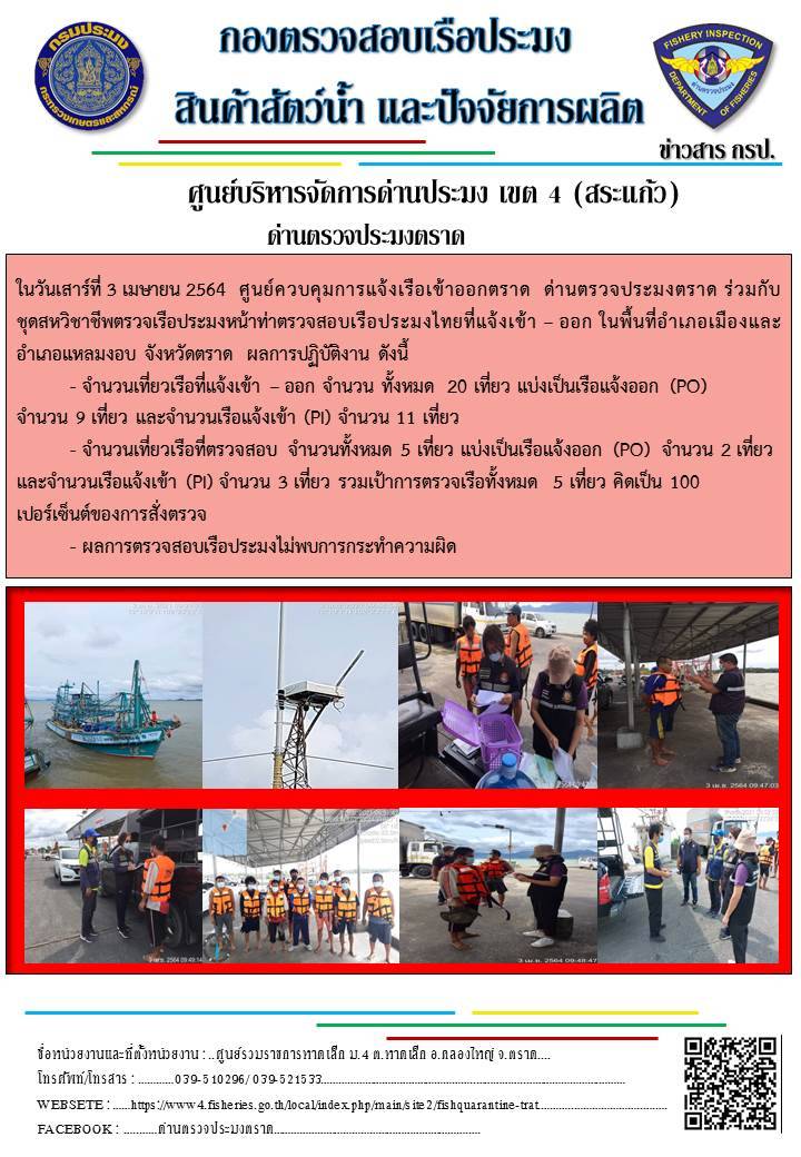 วันที่ 3 เมษายน 2564 ด่านตรวจประมงตราด  ตรวจสอบการนำเข้า – ส่งออกสินค้าสัตว์น้ำ ณ จุดผ่านแดนถาวรบ้านหาดเล็ก ตรวจสอบเรือประมงต่างประเทศ จุด choke point ท่าเทียบเรือกัลปังหา อำเภอคลองใหญ่ จังหวัดตราด และ ตรวจสอบเรือประมงไทย ที่แจ้งเข้า - ออกผ่านระบบ Fishing info2 ร่วมกับชุดสหวิชาชีพ กรมเจ้าท่า กรมจัดหางาน กรมสวัสดิการ และคุ้มครองแผนงาน และล่ามภาษากัมพูชา เขตพื้นที่อำเภอคลองใหญ่ อำเภอเมืองและอำเภอแหลมงอบ จังหวัดตราด..คลิก