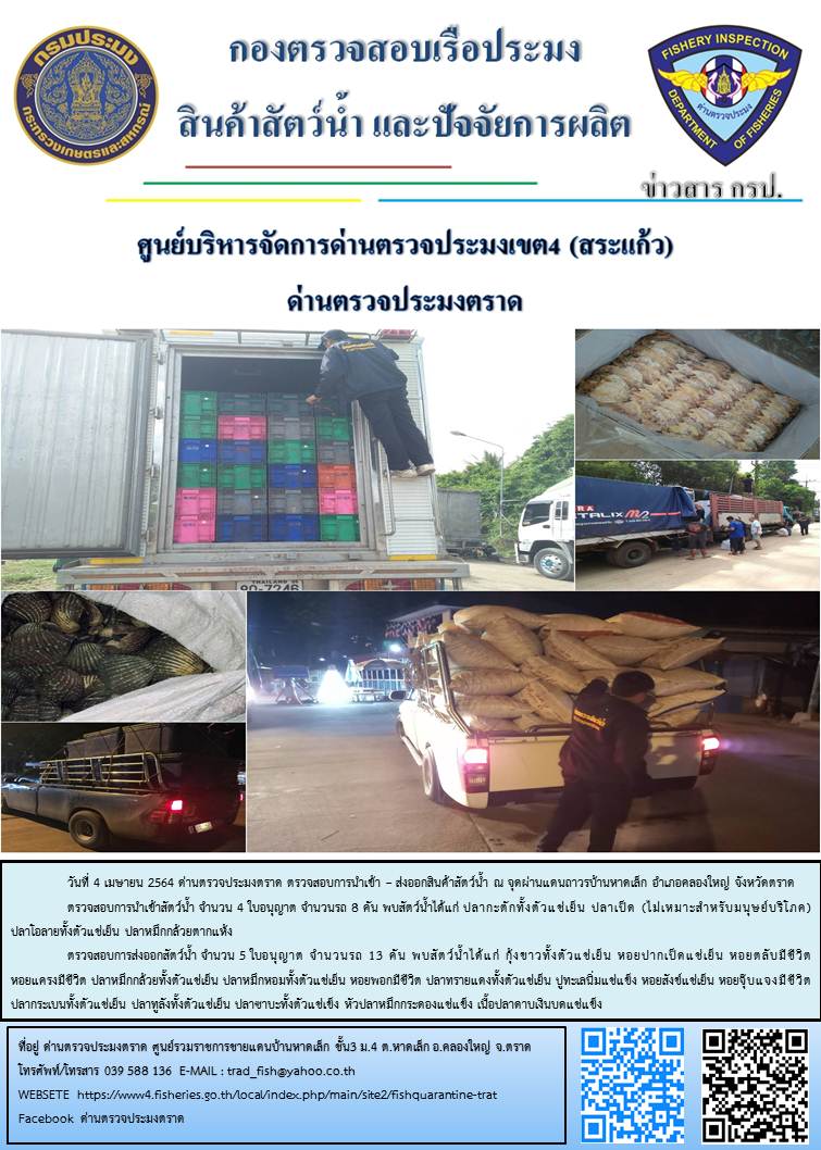 วันที่ 4 เมษายน 2564 ด่านตรวจประมงตราด  ตรวจสอบการนำเข้า – ส่งออกสินค้าสัตว์น้ำ ณ จุดผ่านแดนถาวรบ้านหาดเล็ก  อำเภอคลองใหญ่ จังหวัดตราด และ ตรวจสอบเรือประมงไทย ที่แจ้งเข้า - ออกผ่านระบบ Fishing info2 ร่วมกับชุดสหวิชาชีพ กรมเจ้าท่า กรมจัดหางาน กรมสวัสดิการ และคุ้มครองแผนงาน และล่ามภาษากัมพูชา เขตพื้นที่อำเภอคลองใหญ่ อำเภอเมืองและอำเภอแหลมงอบ จังหวัดตราด..คลิก