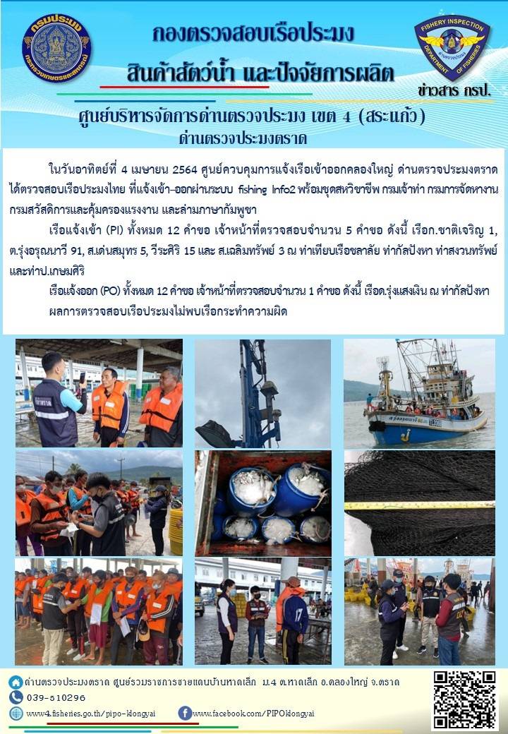 วันที่ 4 เมษายน 2564 ด่านตรวจประมงตราด ตรวจสอบการนำเข้า – ส่งออกสินค้าสัตว์น้ำ ณ จุดผ่านแดนถาวรบ้านหาดเล็ก อำเภอคลองใหญ่ จังหวัดตราด และ ตรวจสอบเรือประมงไทย ที่แจ้งเข้า - ออกผ่านระบบ Fishing info2 ร่วมกับชุดสหวิชาชีพ กรมเจ้าท่า กรมจัดหางาน กรมสวัสดิการ และคุ้มครองแผนงาน และล่ามภาษากัมพูชา เขตพื้นที่อำเภอคลองใหญ่ อำเภอเมืองและอำเภอแหลมงอบ จังหวัดตราด