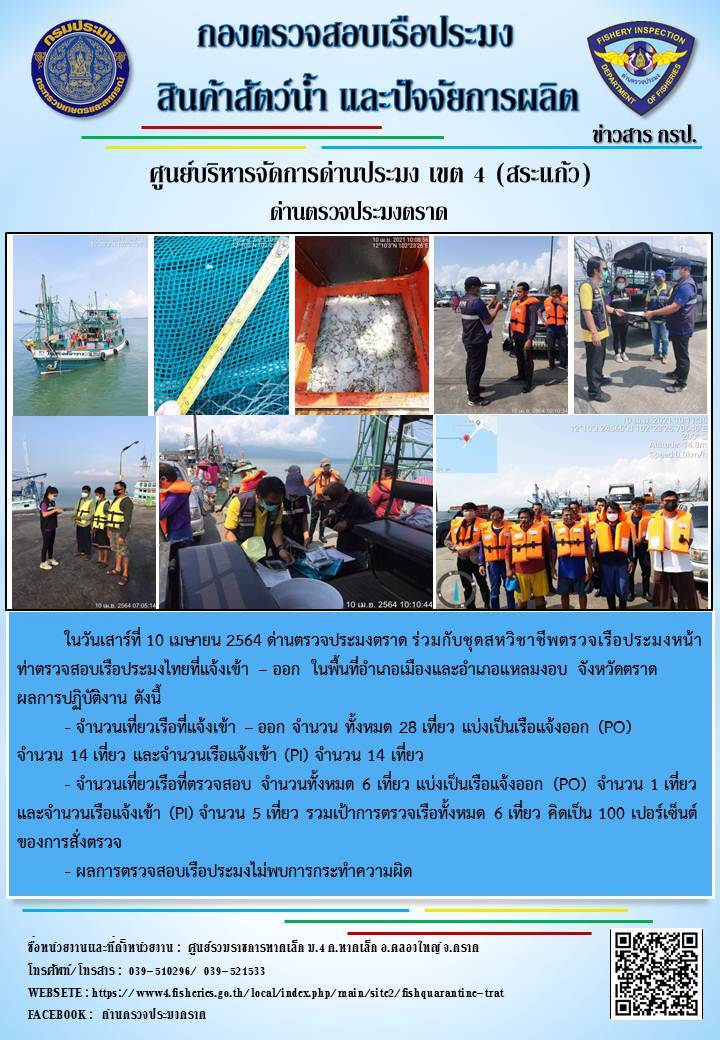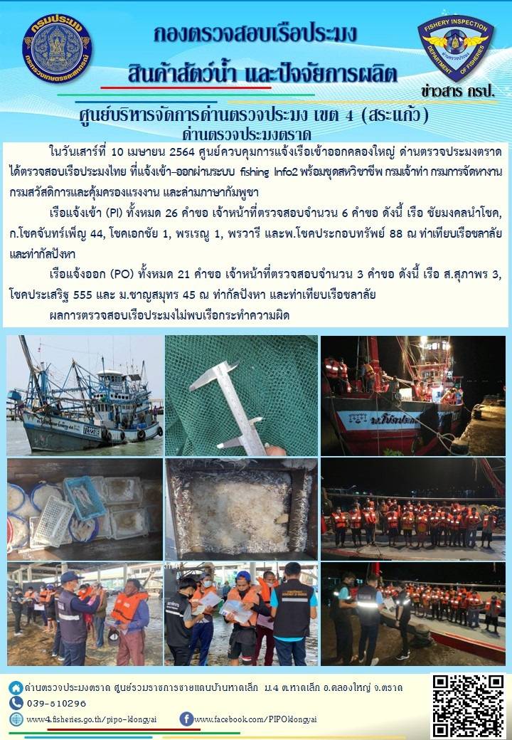 วันที่ 10 เมษายน 2564 ด่านตรวจประมงตราด  ตรวจสอบการนำเข้า – ส่งออกสินค้าสัตว์น้ำและผลิตภัณฑ์สัตว์น้ำ ณ จุดผ่านแดนถาวรบ้านหาดเล็ก ตรวจสอบเรือประมงต่างประเทศ จุด choke point ท่าเทียบเรือกัลปังหา   อำเภอคลองใหญ่ จังหวัดตราด และ ตรวจสอบเรือประมงไทย ที่แจ้งเข้า - ออกผ่านระบบ Fishing info2 ร่วมกับชุดสหวิชาชีพ กรมเจ้าท่า กรมจัดหางาน กรมสวัสดิการ และคุ้มครองแผนงาน และล่ามภาษากัมพูชา เขตพื้นที่อำเภอคลองใหญ่ อำเภอเมืองและอำเภอแหลมงอบ จังหวัดตราด..คลิก