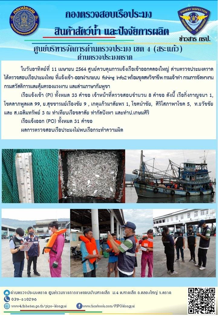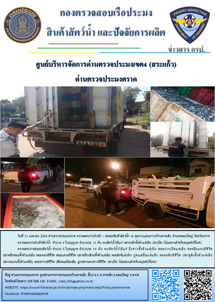วันที่ 11 เมษายน 2564 ด่านตรวจประมงตราด  ตรวจสอบการนำเข้า – ส่งออกสินค้าสัตว์น้ำ ณ จุดผ่านแดนถาวรบ้านหาดเล็ก  อำเภอคลองใหญ่ จังหวัดตราด และ ตรวจสอบเรือประมงไทย ที่แจ้งเข้า - ออกผ่านระบบ Fishing info2 ร่วมกับชุดสหวิชาชีพ กรมเจ้าท่า กรมจัดหางาน กรมสวัสดิการ และคุ้มครองแผนงาน และล่ามภาษากัมพูชา เขตพื้นที่อำเภอคลองใหญ่ อำเภอเมืองและอำเภอแหลมงอบ จังหวัดตราด..คลิก