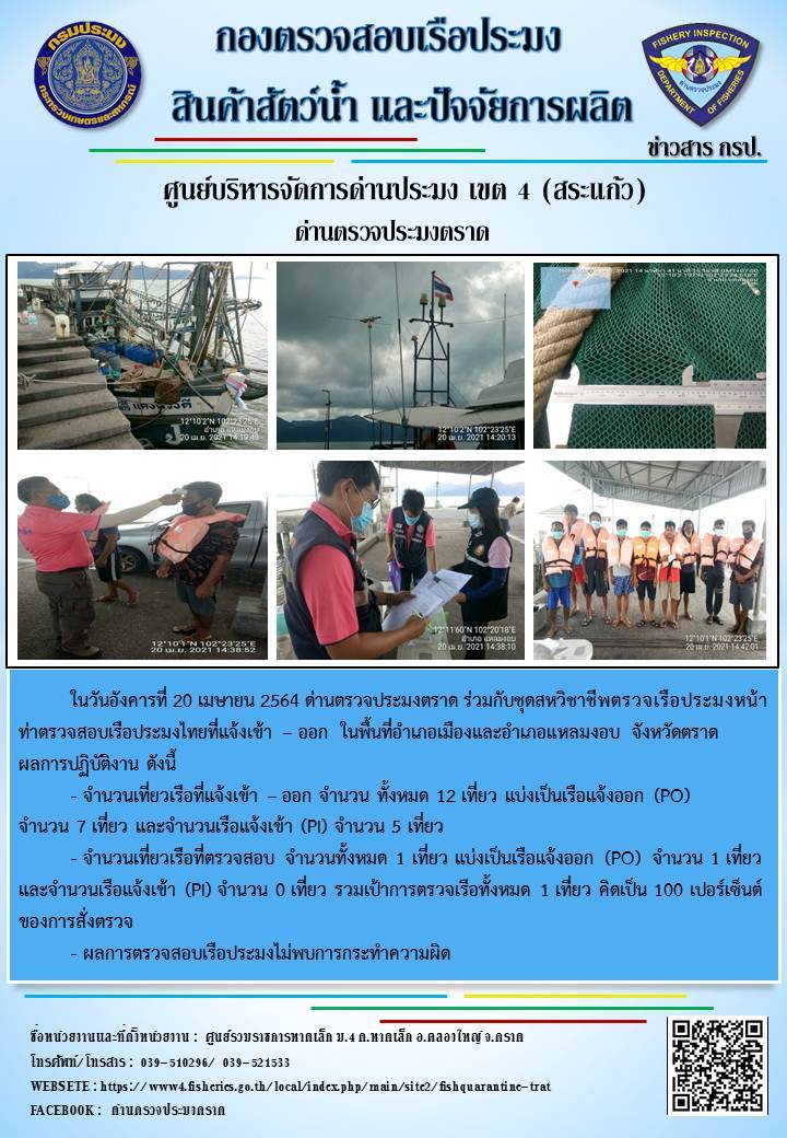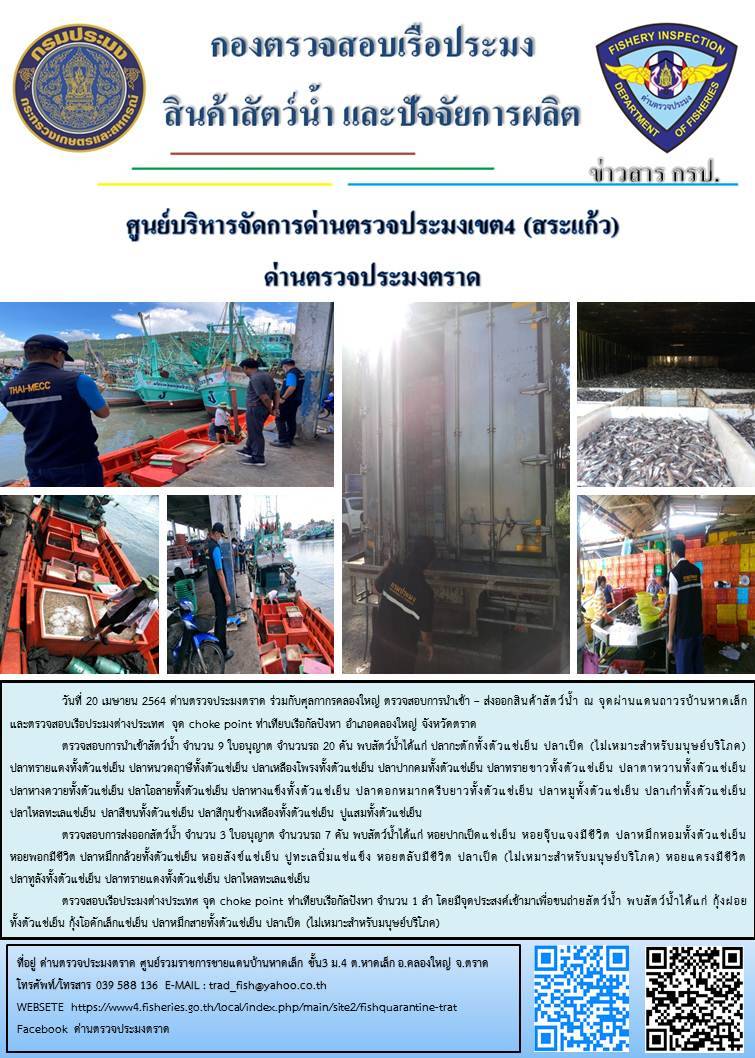 วันที่ 20 เมษายน 2564 ด่านตรวจประมงตราด  ตรวจสอบการนำเข้า – ส่งออกสินค้าสัตว์น้ำ ณ จุดผ่านแดนถาวรบ้านหาดเล็ก ตรวจสอบเรือประมงต่างประเทศ จุด choke point ท่าเทียบเรือกัลปังหา อำเภอคลองใหญ่ จังหวัดตราด และ ตรวจสอบเรือประมงไทย ที่แจ้งเข้า - ออกผ่านระบบ Fishing info2 ร่วมกับชุดสหวิชาชีพ กรมเจ้าท่า กรมจัดหางาน กรมสวัสดิการ และคุ้มครองแผนงาน และล่ามภาษากัมพูชา เขตพื้นที่อำเภอคลองใหญ่ อำเภอเมืองและอำเภอแหลมงอบ จังหวัดตราด..คลิก