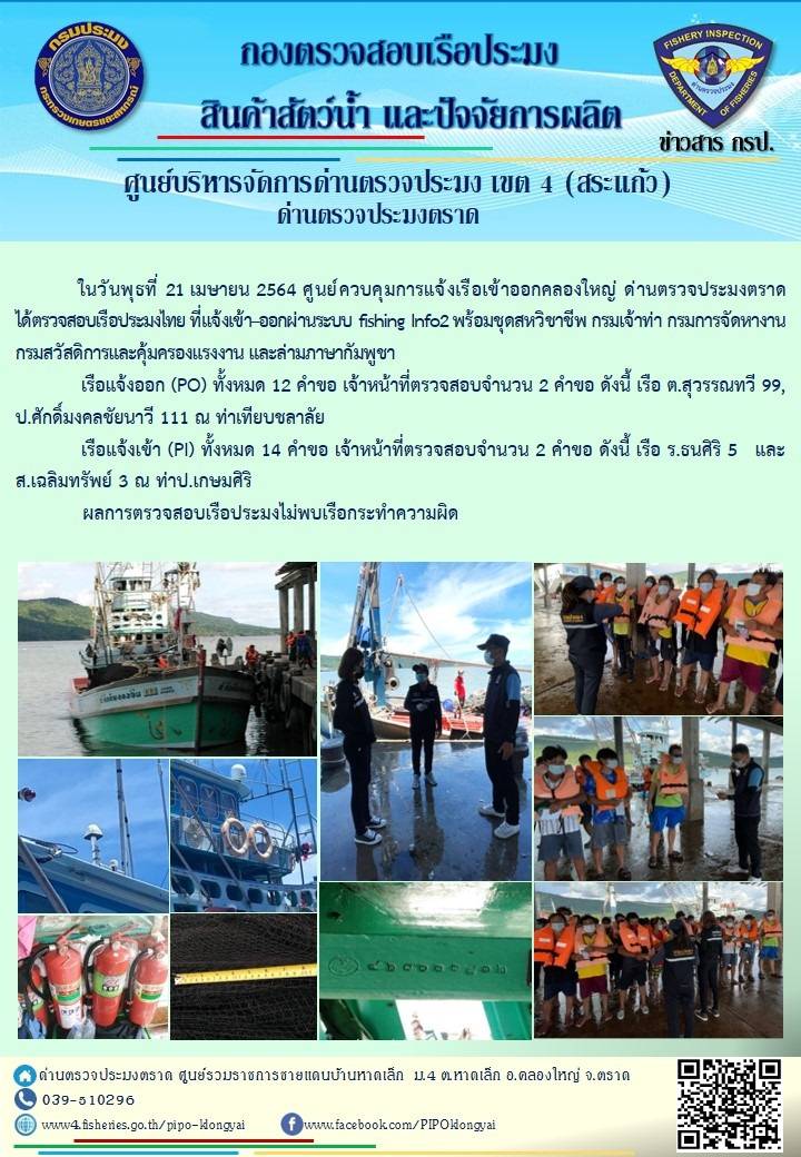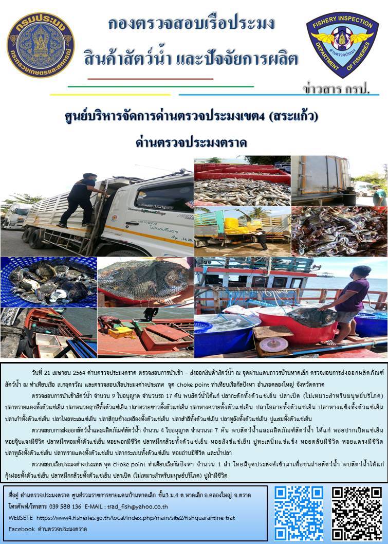 วันที่ 21 เมษายน 2564 ด่านตรวจประมงตราด  ตรวจสอบการนำเข้า – ส่งออกสินค้าสัตว์น้ำ ณ จุดผ่านแดนถาวรบ้านหาดเล็ก ตรวจสอบการส่งออกผลิตภัณฑ์สัตว์น้ำ ณ ท่าเทียบเรือ ส.กฤตรวัณ ตรวจสอบเรือประมงต่างประเทศ จุด choke point ท่าเทียบเรือกัลปังหา อำเภอคลองใหญ่ จังหวัดตราด และ ตรวจสอบเรือประมงไทย ที่แจ้งเข้า - ออกผ่านระบบ Fishing info2 ร่วมกับชุดสหวิชาชีพ กรมเจ้าท่า กรมจัดหางาน กรมสวัสดิการ และคุ้มครองแผนงาน และล่ามภาษากัมพูชา เขตพื้นที่อำเภอคลองใหญ่ อำเภอเมืองและอำเภอแหลมงอบ จังหวัดตราด..คลิก