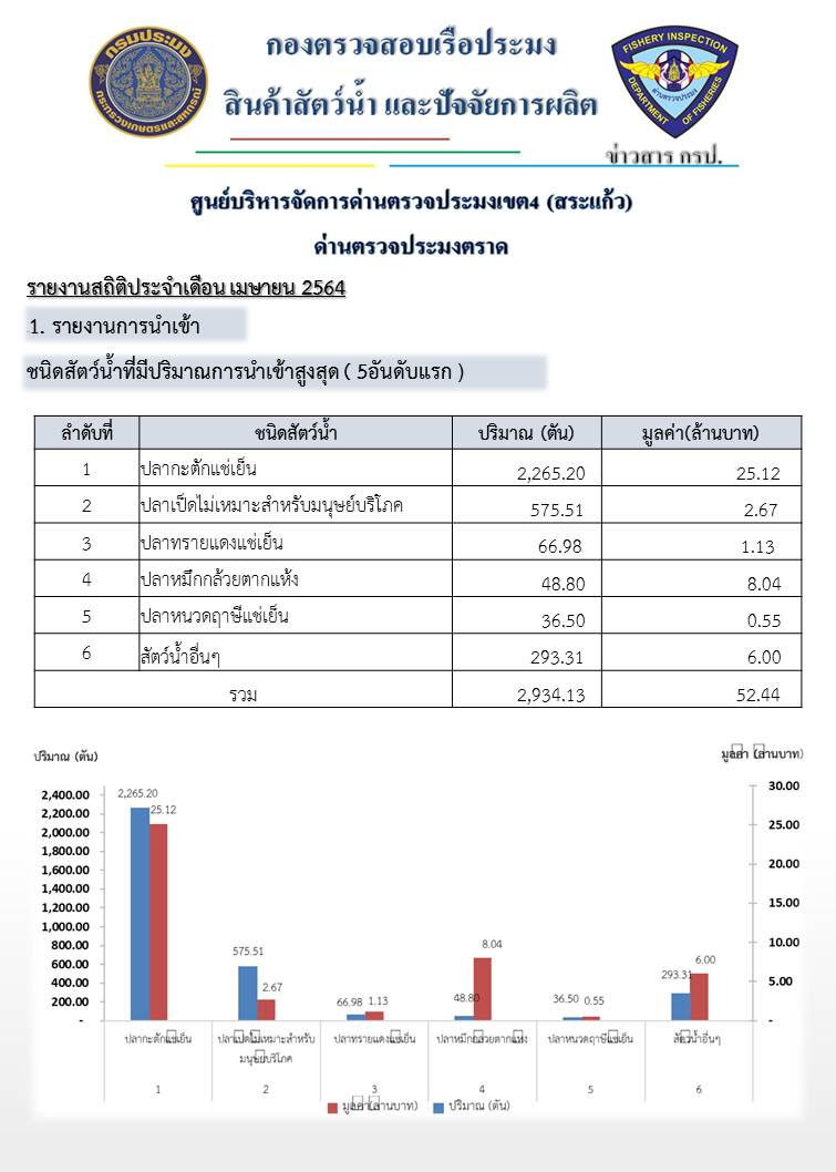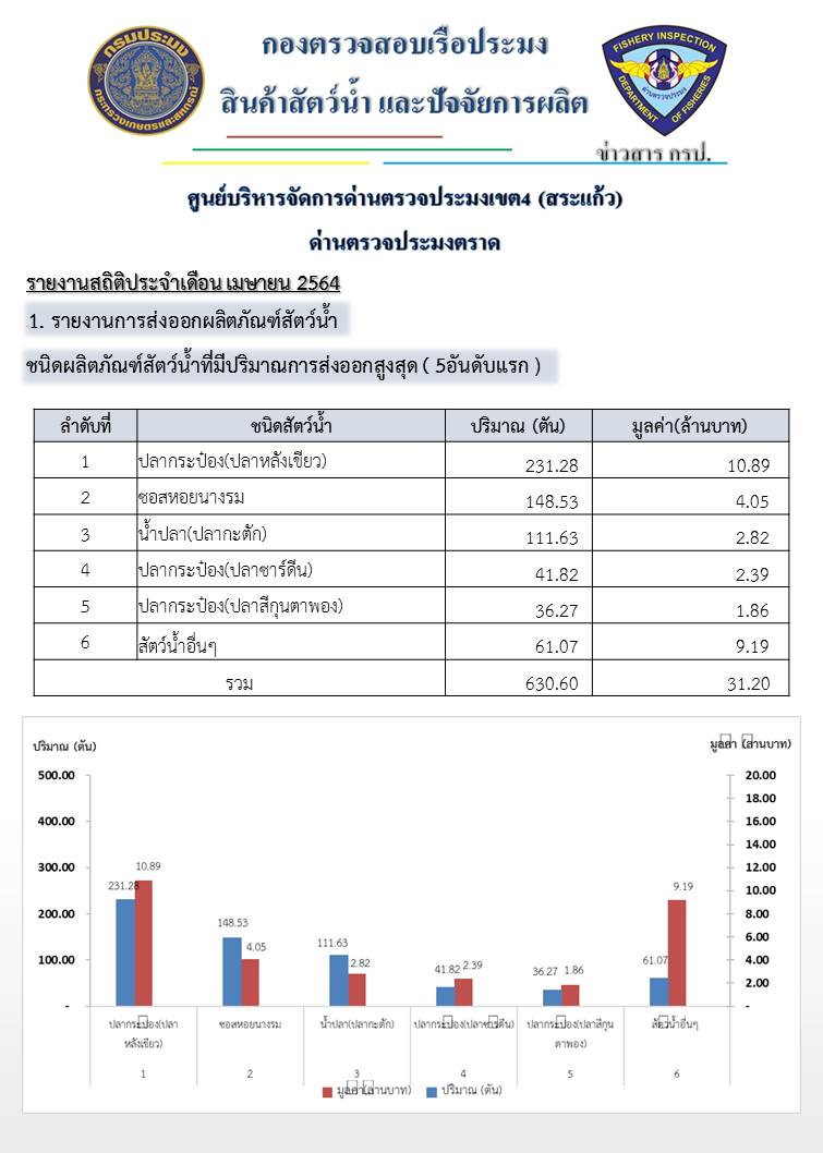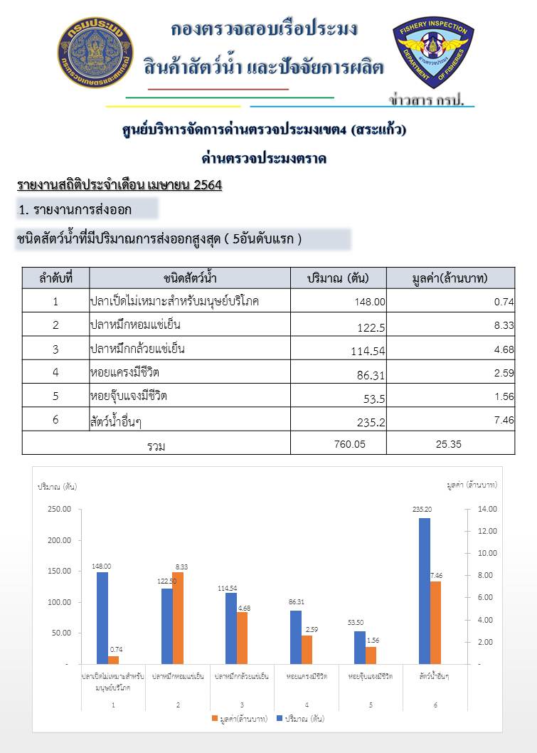รายงานการนำเข้า ส่งออกสินค้าสัตว์น้ำและผลิตภัณฑ์สัตว์น้ำ จำนวนเรือประมงต่างประเทศที่เข้าเทียบท่าผ่านทางด่านตรวจประมงตราด ประจำเดือน เมษายน 2564