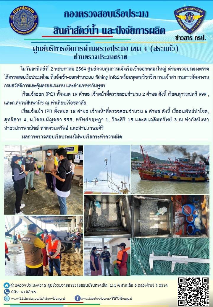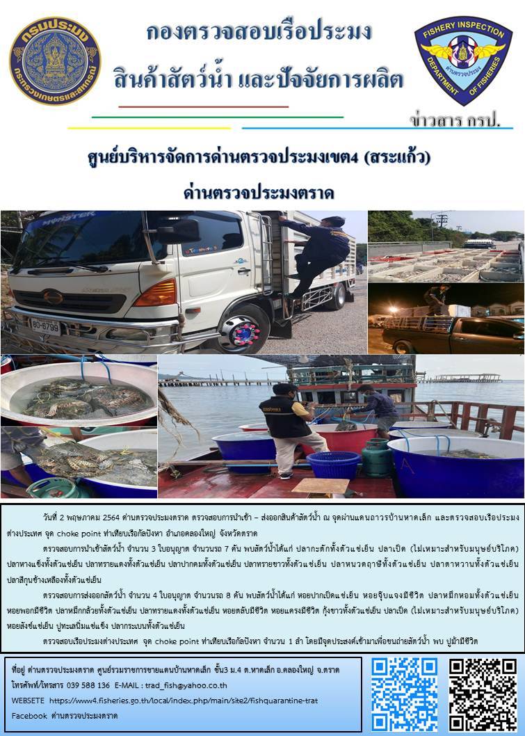 วันที่ 2 พฤษภาคม 2564 ด่านตรวจประมงตราด  ตรวจสอบการนำเข้า – ส่งออกสินค้าสัตว์น้ำ ณ จุดผ่านแดนถาวรบ้านหาดเล็ก ตรวจสอบเรือประมงต่างประเทศ จุด choke point ท่าเทียบเรือกัลปังหา อำเภอคลองใหญ่ จังหวัดตราด และ ตรวจสอบเรือประมงไทย ที่แจ้งเข้า - ออกผ่านระบบ Fishing info2 ร่วมกับชุดสหวิชาชีพ กรมเจ้าท่า กรมจัดหางาน กรมสวัสดิการ และคุ้มครองแผนงาน และล่ามภาษากัมพูชา เขตพื้นที่อำเภอคลองใหญ่ อำเภอเมืองและอำเภอแหลมงอบ จังหวัดตราด..คลิก