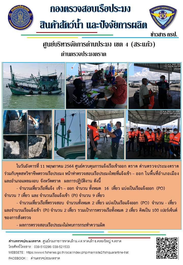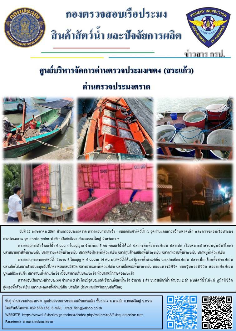 วันที่ 11 พฤษภาคม 2564 ด่านตรวจประมงตราด  ตรวจสอบการนำเข้า – ส่งออกสินค้าสัตว์น้ำ ณ จุดผ่านแดนถาวรบ้านหาดเล็ก ตรวจสอบเรือประมงต่างประเทศ จุด choke point ท่าเทียบเรือกัลปังหา อำเภอคลองใหญ่ จังหวัดตราด และ ตรวจสอบเรือประมงไทย ที่แจ้งเข้า - ออกผ่านระบบ Fishing info2 ร่วมกับชุดสหวิชาชีพ กรมเจ้าท่า กรมจัดหางาน กรมสวัสดิการ และคุ้มครองแผนงาน และล่ามภาษากัมพูชา เขตพื้นที่อำเภอคลองใหญ่ อำเภอเมืองและอำเภอแหลมงอบ จังหวัดตราด..คลิก
