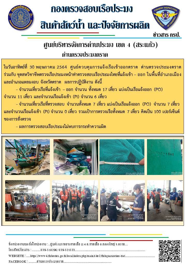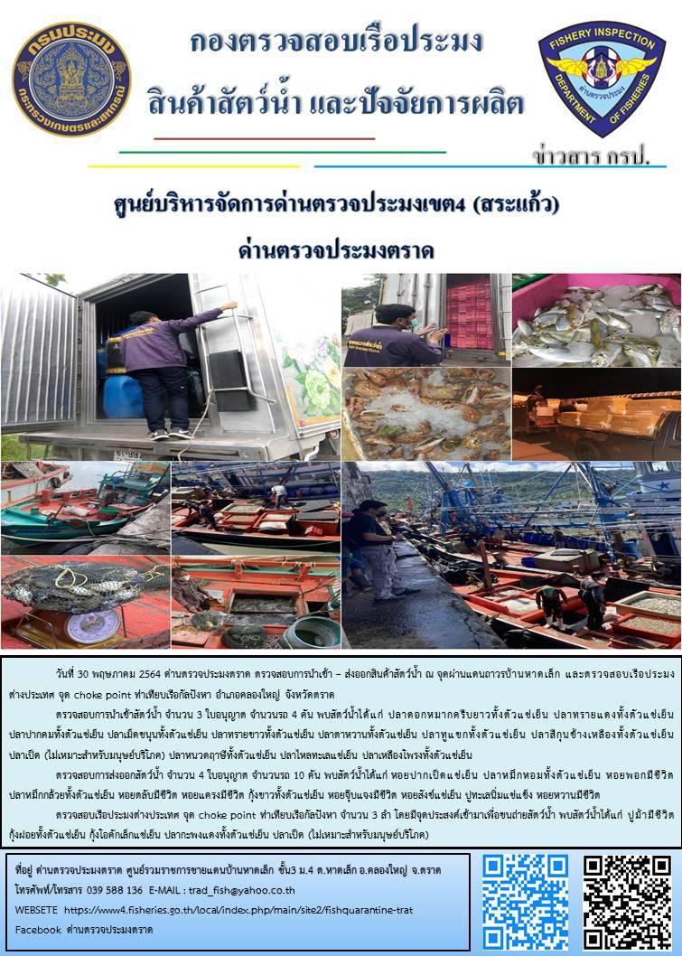 วันที่ 30 พฤษภาคม 2564 ด่านตรวจประมงตราด  ตรวจสอบการนำเข้า – ส่งออกสินค้าสัตว์น้ำ ณ จุดผ่านแดนถาวรบ้านหาดเล็ก  ตรวจสอบเรือประมงต่างประเทศ จุด choke point ท่าเทียบเรือกัลปังหา อำเภอคลองใหญ่ จังหวัดตราด และ ตรวจสอบเรือประมงไทย ที่แจ้งเข้า - ออกผ่านระบบ Fishing info2 ร่วมกับชุดสหวิชาชีพ กรมเจ้าท่า กรมจัดหางาน กรมสวัสดิการ และคุ้มครองแผนงาน และล่ามภาษากัมพูชา เขตพื้นที่อำเภอคลองใหญ่ อำเภอเมืองและอำเภอแหลมงอบ จังหวัดตราด..คลิก