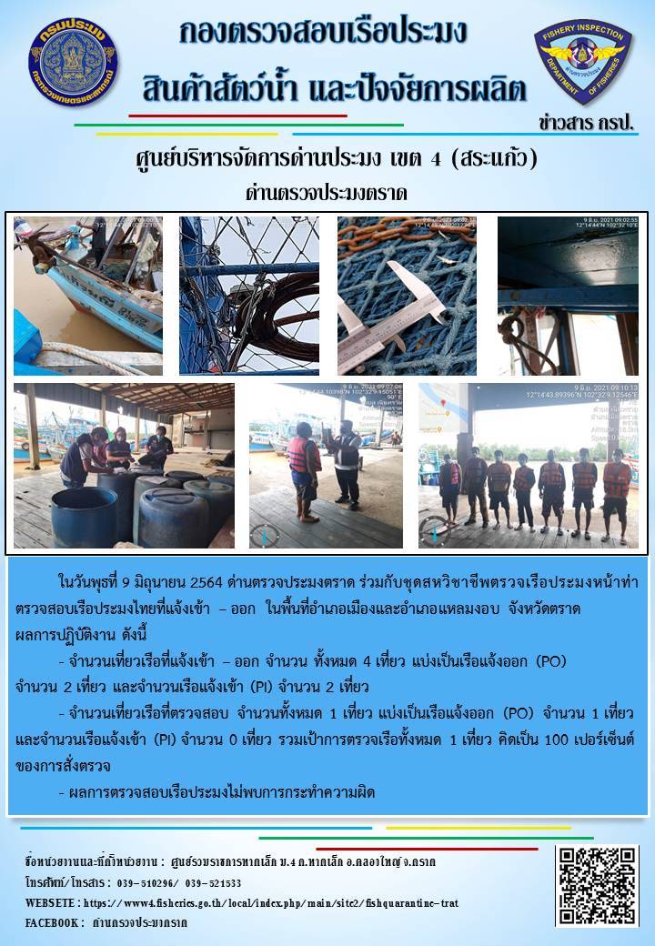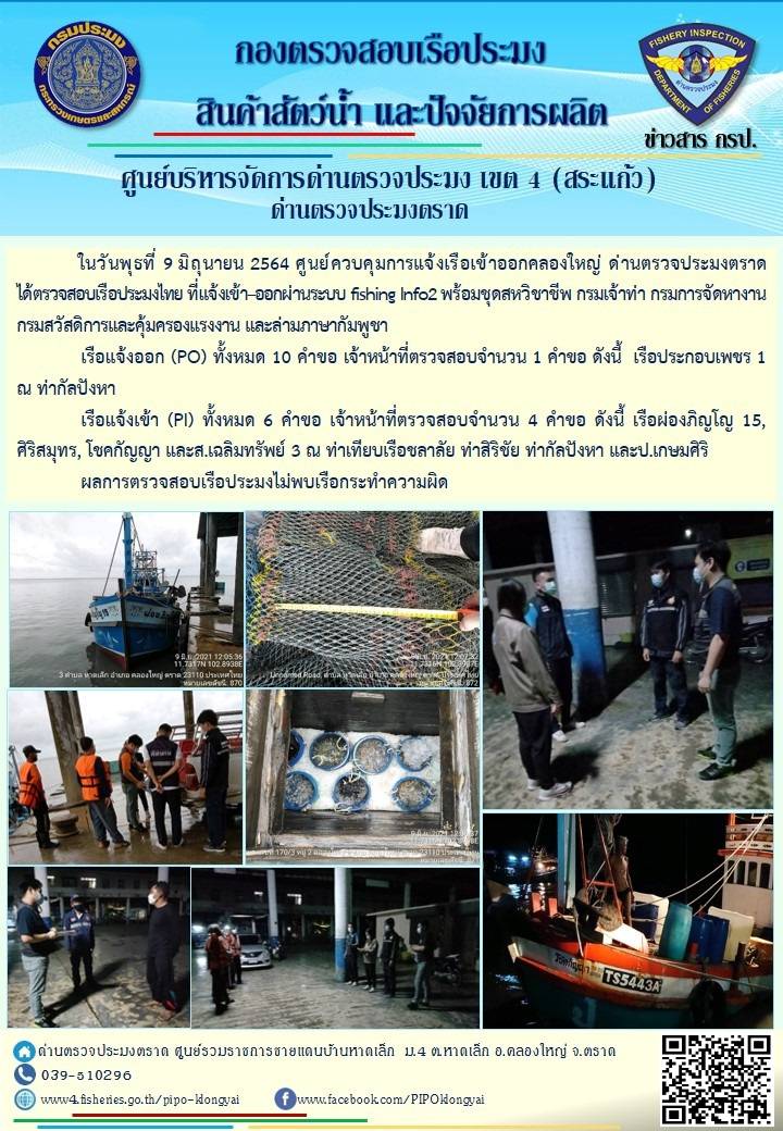 วันที่ 9 มิถุนายน 2564 ด่านตรวจประมงตราด  ตรวจสอบการนำเข้า – ส่งออกสินค้าสัตว์น้ำและผลิตภัณฑ์สัตว์น้ำ ณ จุดผ่านแดนถาวรบ้านหาดเล็ก  ตรวจสอบเรือประมงต่างประเทศ จุด choke point ท่าเทียบเรือกัลปังหา อำเภอคลองใหญ่ จังหวัดตราด และ ตรวจสอบเรือประมงไทย ที่แจ้งเข้า - ออกผ่านระบบ Fishing info2 ร่วมกับชุดสหวิชาชีพ กรมเจ้าท่า กรมจัดหางาน กรมสวัสดิการ และคุ้มครองแผนงาน และล่ามภาษากัมพูชา เขตพื้นที่อำเภอคลองใหญ่ อำเภอเมืองและอำเภอแหลมงอบ จังหวัดตราด..คลิก