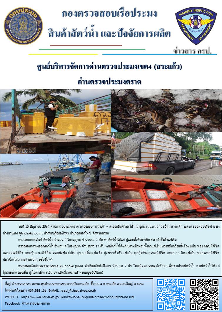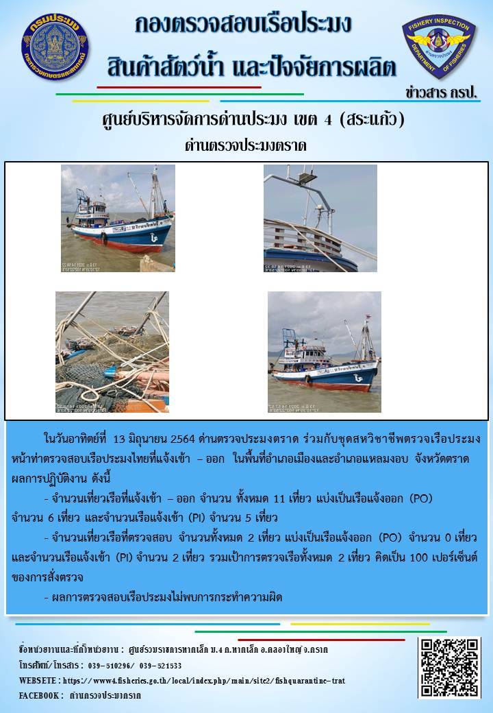 วันที่ 13 มิถุนายน 2564 ด่านตรวจประมงตราด  ตรวจสอบการนำเข้า – ส่งออกสินค้าสัตว์น้ำ ณ จุดผ่านแดนถาวรบ้านหาดเล็ก  ตรวจสอบเรือประมงต่างประเทศ จุด choke point ท่าเทียบเรือกัลปังหา อำเภอคลองใหญ่ จังหวัดตราด และ ตรวจสอบเรือประมงไทย ที่แจ้งเข้า - ออกผ่านระบบ Fishing info2 ร่วมกับชุดสหวิชาชีพ กรมเจ้าท่า กรมจัดหางาน กรมสวัสดิการ และคุ้มครองแผนงาน และล่ามภาษากัมพูชา เขตพื้นที่อำเภอคลองใหญ่ อำเภอเมืองและอำเภอแหลมงอบ จังหวัดตราด..คลิก