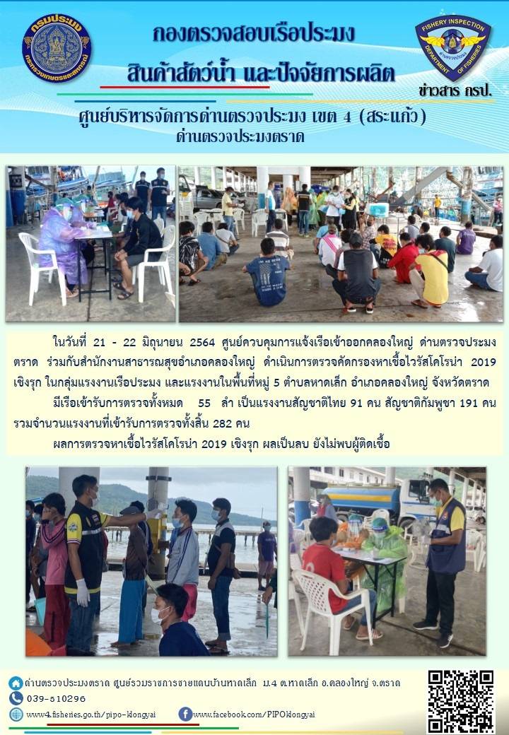 วันที่ 23 มิถุนายน 2564 ด่านตรวจประมงตราด  ตรวจสอบการนำเข้า – ส่งออกสินค้าสัตว์น้ำ ณ จุดผ่านแดนถาวรบ้านหาดเล็ก ตรวจสอบเรือประมงต่างประเทศ จุด choke point ท่าเทียบเรือกัลปังหา อำเภอคลองใหญ่ จังหวัดตราด และ ตรวจสอบเรือประมงไทย ที่แจ้งเข้า - ออกผ่านระบบ Fishing info2 ร่วมกับชุดสหวิชาชีพ กรมเจ้าท่า กรมจัดหางาน กรมสวัสดิการ และคุ้มครองแผนงาน และล่ามภาษากัมพูชา เขตพื้นที่อำเภอคลองใหญ่ อำเภอเมืองและอำเภอแหลมงอบ จังหวัดตราด..คลิก
