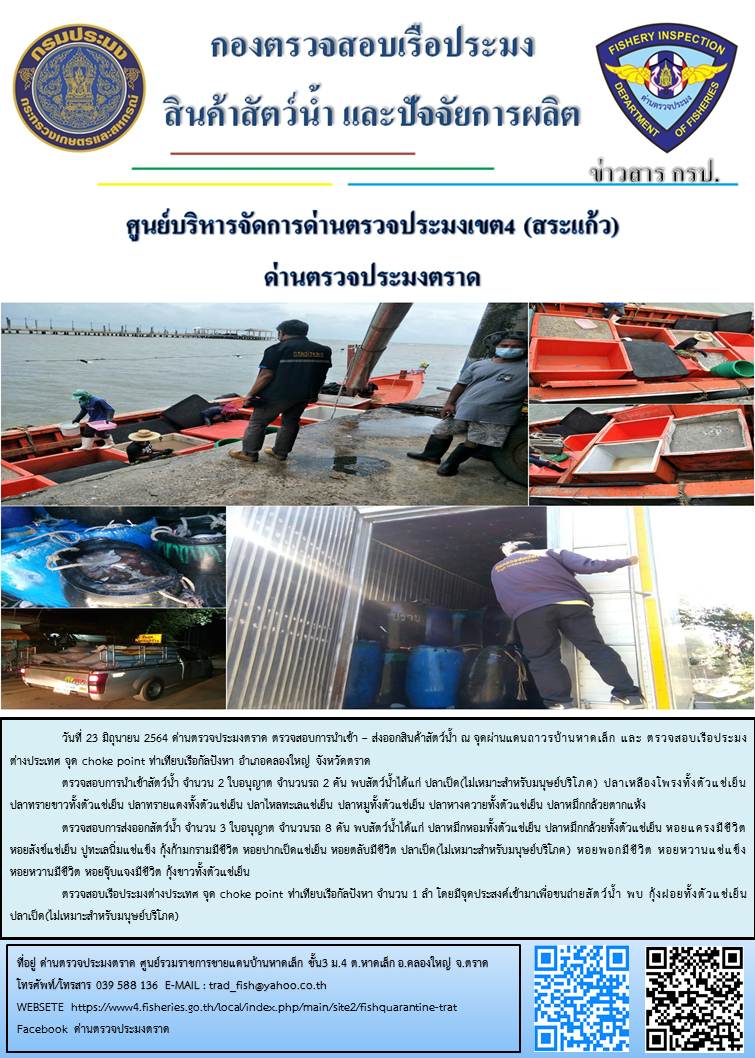วันที่ 23 มิถุนายน 2564 ด่านตรวจประมงตราด ตรวจสอบการนำเข้า – ส่งออกสินค้าสัตว์น้ำ ณ จุดผ่านแดนถาวรบ้านหาดเล็ก ตรวจสอบเรือประมงต่างประเทศ จุด choke point ท่าเทียบเรือกัลปังหา อำเภอคลองใหญ่ จังหวัดตราด และ ตรวจสอบเรือประมงไทย ที่แจ้งเข้า - ออกผ่านระบบ Fishing info2 ร่วมกับชุดสหวิชาชีพ กรมเจ้าท่า กรมจัดหางาน กรมสวัสดิการ และคุ้มครองแผนงาน และล่ามภาษากัมพูชา เขตพื้นที่อำเภอคลองใหญ่ อำเภอเมืองและอำเภอแหลมงอบ จังหวัดตราด