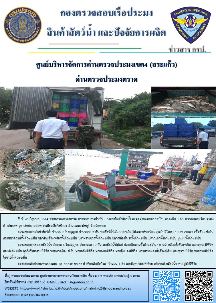 วันที่ 28 มิถุนายน 2564 ด่านตรวจประมงตราด  ตรวจสอบการนำเข้า – ส่งออกสินค้าสัตว์น้ำ ณ จุดผ่านแดนถาวรบ้านหาดเล็ก ตรวจสอบเรือประมงต่างประเทศ จุด choke point ท่าเทียบเรือกัลปังหา อำเภอคลองใหญ่ จังหวัดตราด และ ตรวจสอบเรือประมงไทย ที่แจ้งเข้า - ออกผ่านระบบ Fishing info2 ร่วมกับชุดสหวิชาชีพ เขตพื้นที่อำเภอเมืองและอำเภอแหลมงอบ จังหวัดตราด..คลิก