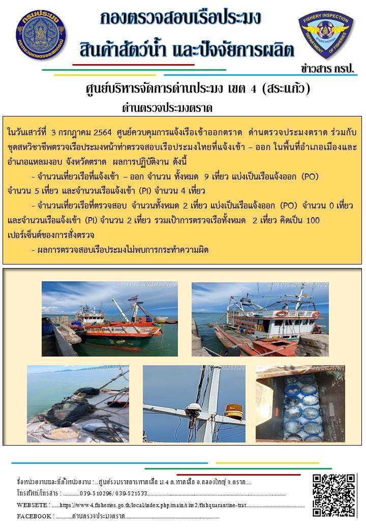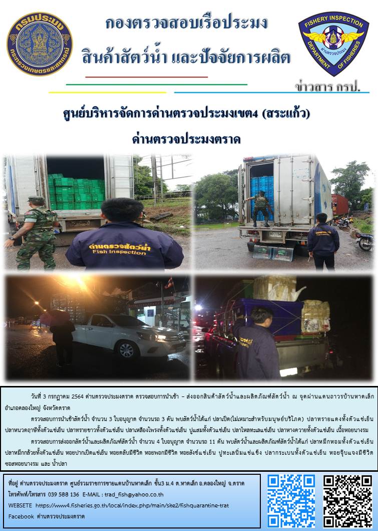 วันที่ 3 กรกฎาคม 2564 ด่านตรวจประมงตราด  ตรวจสอบการนำเข้า – ส่งออกสินค้าสัตว์น้ำและผลิตภัณฑ์สัตว์น้ำ ณ จุดผ่านแดนถาวรบ้านหาดเล็ก   อำเภอคลองใหญ่ จังหวัดตราด และ ตรวจสอบเรือประมงไทย ที่แจ้งเข้า - ออกผ่านระบบ Fishing info2 ร่วมกับชุดสหวิชาชีพ กรมเจ้าท่า กรมจัดหางาน กรมสวัสดิการ และคุ้มครองแผนงาน และล่ามภาษากัมพูชา เขตพื้นที่อำเภอคลองใหญ่ อำเภอเมืองและอำเภอแหลมงอบ จังหวัดตราด..คลิก