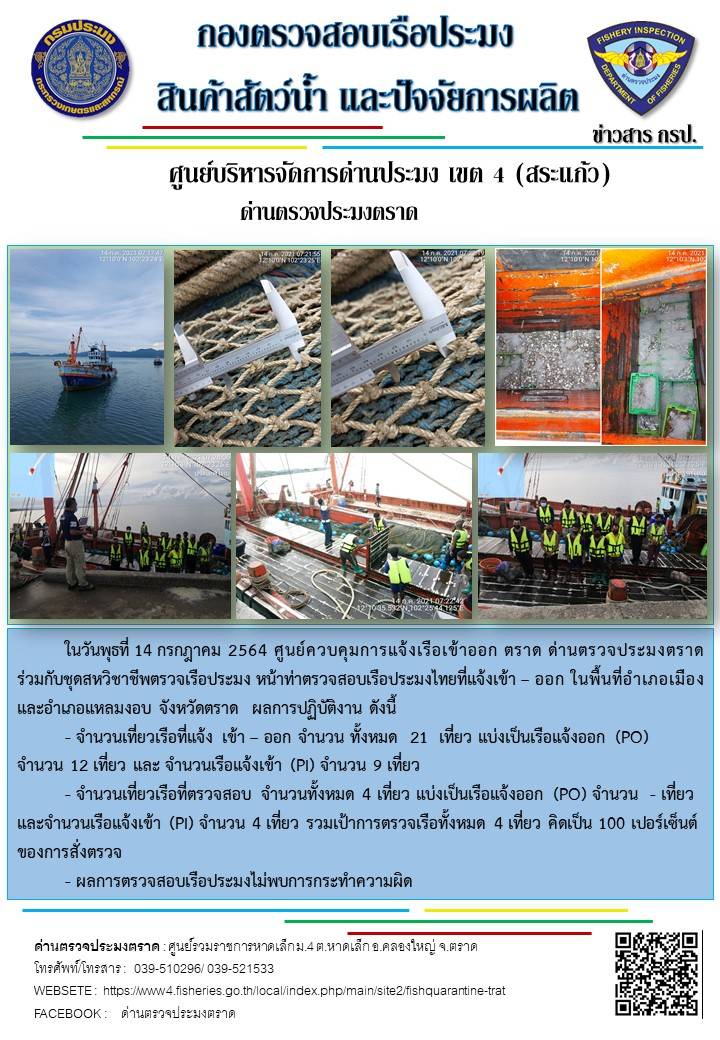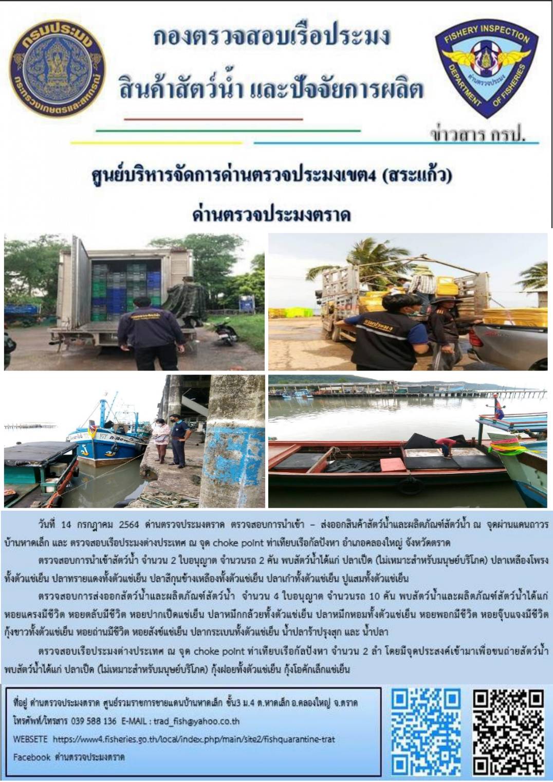 วันที่ 14 กรกฎาคม 2564 ด่านตรวจประมงตราด  ตรวจสอบการนำเข้า – ส่งออกสินค้าสัตว์น้ำและผลิตภัณฑ์สัตว์น้ำ ณ จุดผ่านแดนถาวรบ้านหาดเล็ก  ตรวจสอบเรือประมงต่างประเทศ จุด choke point ท่าเทียบเรือกัลปังหา อำเภอคลองใหญ่ จังหวัดตราด และ ตรวจสอบเรือประมงไทย ที่แจ้งเข้า - ออกผ่านระบบ Fishing info2 ร่วมกับชุดสหวิชาชีพ กรมเจ้าท่า กรมจัดหางาน กรมสวัสดิการ และคุ้มครองแผนงาน และล่ามภาษากัมพูชา เขตพื้นที่อำเภอคลองใหญ่ อำเภอเมืองและอำเภอแหลมงอบ จังหวัดตราด..คลิก
