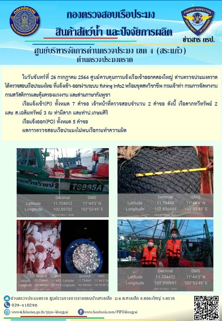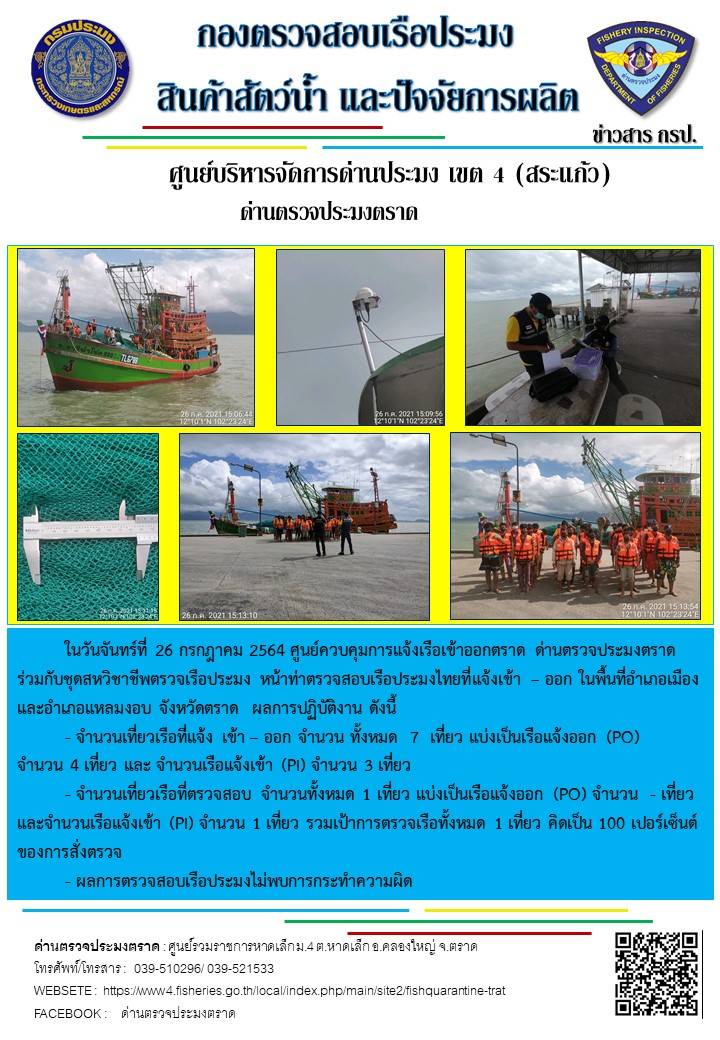 วันที่ 26 กรกฎาคม 2564 ด่านตรวจประมงตราด  ตรวจสอบการนำเข้า – ส่งออกสินค้าสัตว์น้ำ ณ จุดผ่านแดนถาวรบ้านหาดเล็ก ตรวจสอบการส่งออกผลิตภัณฑ์สัตว์น้ำ ณ ท่าเทียบเรือ ส.กฤตรวัณ  ตรวจสอบเรือประมงต่างประเทศ จุด choke point ท่าเทียบเรือกัลปังหา อำเภอคลองใหญ่ จังหวัดตราด และ ตรวจสอบเรือประมงไทย ที่แจ้งเข้า - ออกผ่านระบบ Fishing info2 ร่วมกับชุดสหวิชาชีพ กรมเจ้าท่า กรมจัดหางาน กรมสวัสดิการ และคุ้มครองแผนงาน และล่ามภาษากัมพูชา เขตพื้นที่อำเภอคลองใหญ่ อำเภอเมืองและอำเภอแหลมงอบ จังหวัดตราด..คลิก