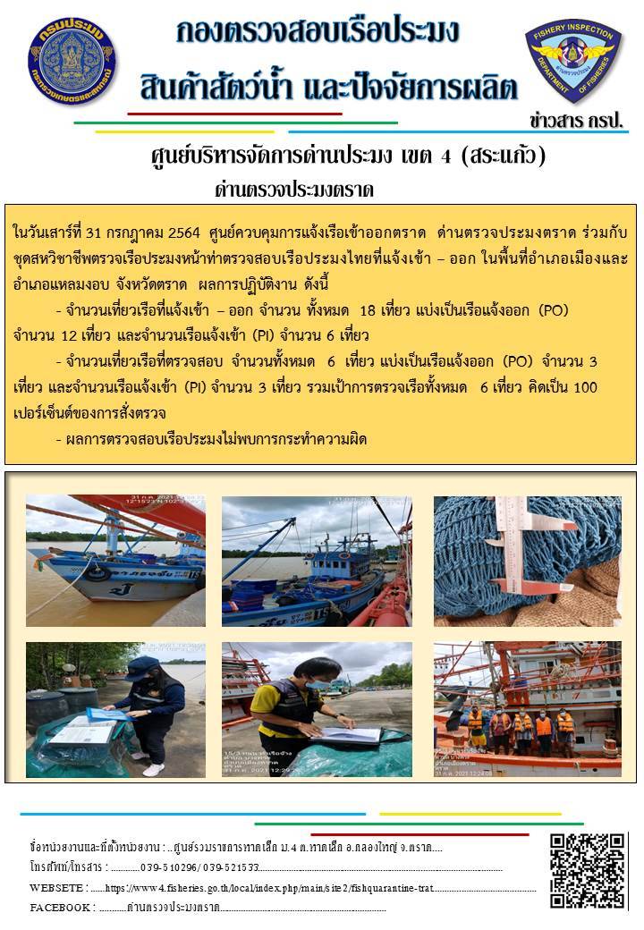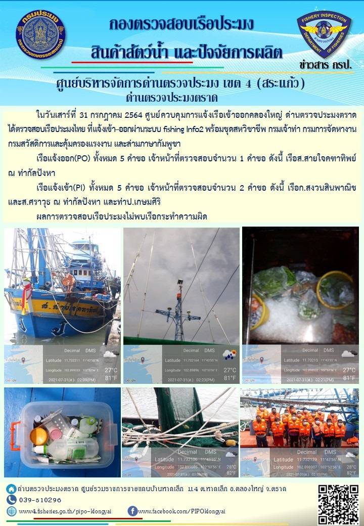 วันที่ 31 กรกฎาคม 2564 ด่านตรวจประมงตราด  ตรวจสอบการนำเข้า – ส่งออกสินค้าสัตว์น้ำ ณ จุดผ่านแดนถาวรบ้านหาดเล็ก  ตรวจสอบเรือประมงต่างประเทศ จุด choke point ท่าเทียบเรือกัลปังหา อำเภอคลองใหญ่ จังหวัดตราด และ ตรวจสอบเรือประมงไทย ที่แจ้งเข้า - ออกผ่านระบบ Fishing info2 ร่วมกับชุดสหวิชาชีพ กรมเจ้าท่า กรมจัดหางาน กรมสวัสดิการ และคุ้มครองแผนงาน และล่ามภาษากัมพูชา เขตพื้นที่อำเภอคลองใหญ่ อำเภอเมืองและอำเภอแหลมงอบ จังหวัดตราด..คลิก
