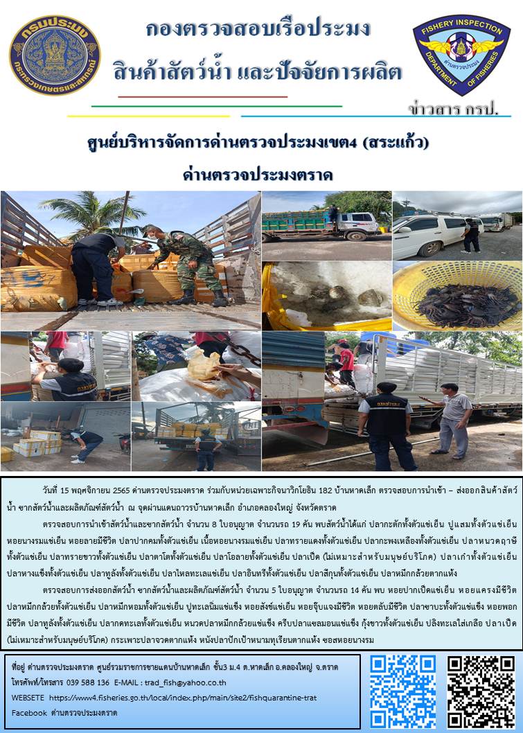 รายละเอียด 1. ส่วนงานควบคุมการนำเข้า - ส่งออกสัตว์น้ำ ซากสัตว์น้ำ และผลิตภัณฑ์สัตว์น้ำ                  สถานที่ตั้งและที่อยู่ : ศูนย์รวมราชการชายแดนบ้านหาดเล็ก ชั้น3 หมู่ 4 ตำบลหาดเล็ก อำเภอคลองใหญ่ จังหวัตราด 23110              โทรศัพท์/โทรสาร : (039)588136              E-MAIL : trad_fish@yahoo.co.th   2. ส่วนงานควบคุมการแจ้งเรือเข้าออกตราด และ ส่วนงานอำนวยการ             สถานที่ตั้งและที่อยู่ : 34 หมู่ 8 ตำบลวังกระแจะ อำเภอเมือง จังหวัดตราด 23000             โทรศัพท์/โทรสาร : (039)521533 , 096-138-0520             E-MAIL : TRAT Fishery Inspection@fisheries.go.th   3. ส่วนงานควบคุมการแจ้งเรือเข้าออกคลองใหญ่             สถานที่ตั้งและที่อยู่ : ท่าเทียบเรือกัลปังหา เลขที่ 86 ถนนเทศบาล 1 ตำบลหาดเล็ก อำเภอคลองใหญ่ จังหวัดตราด 23110             โทรศัพท์/โทรสาร : (039)510296             E-MAIL : pipoklongyai@gmail.com  email  trad_fish@yahoo.co.th  โทรศัพท์ (039)588136 , (039)521533 , (039)510296  FAX (039)588136 , (039)521533 , (039)510296  แฟนเพจ แฟนเพจ