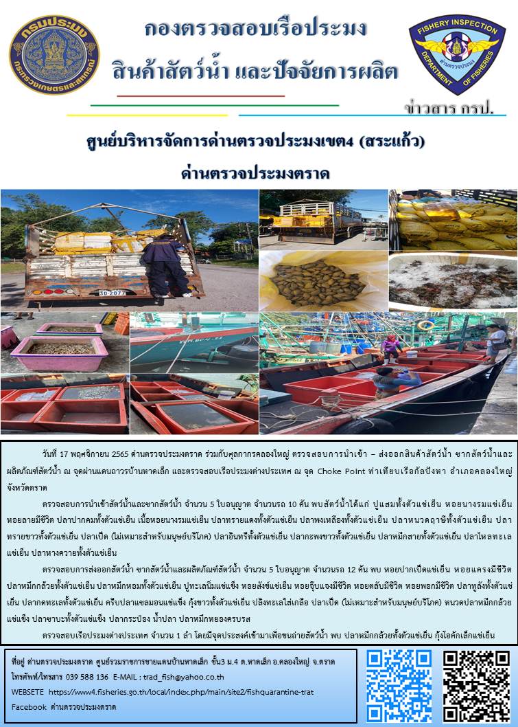 รายละเอียด 1. ส่วนงานควบคุมการนำเข้า - ส่งออกสัตว์น้ำ ซากสัตว์น้ำ และผลิตภัณฑ์สัตว์น้ำ                  สถานที่ตั้งและที่อยู่ : ศูนย์รวมราชการชายแดนบ้านหาดเล็ก ชั้น3 หมู่ 4 ตำบลหาดเล็ก อำเภอคลองใหญ่ จังหวัตราด 23110              โทรศัพท์/โทรสาร : (039)588136              E-MAIL : trad_fish@yahoo.co.th   2. ส่วนงานควบคุมการแจ้งเรือเข้าออกตราด และ ส่วนงานอำนวยการ             สถานที่ตั้งและที่อยู่ : 34 หมู่ 8 ตำบลวังกระแจะ อำเภอเมือง จังหวัดตราด 23000             โทรศัพท์/โทรสาร : (039)521533 , 096-138-0520             E-MAIL : TRAT Fishery Inspection@fisheries.go.th   3. ส่วนงานควบคุมการแจ้งเรือเข้าออกคลองใหญ่             สถานที่ตั้งและที่อยู่ : ท่าเทียบเรือกัลปังหา เลขที่ 86 ถนนเทศบาล 1 ตำบลหาดเล็ก อำเภอคลองใหญ่ จังหวัดตราด 23110             โทรศัพท์/โทรสาร : (039)510296             E-MAIL : pipoklongyai@gmail.com  email  trad_fish@yahoo.co.th  โทรศัพท์ (039)588136 , (039)521533 , (039)510296  FAX (039)588136 , (039)521533 , (039)510296  แฟนเพจ แฟนเพจ