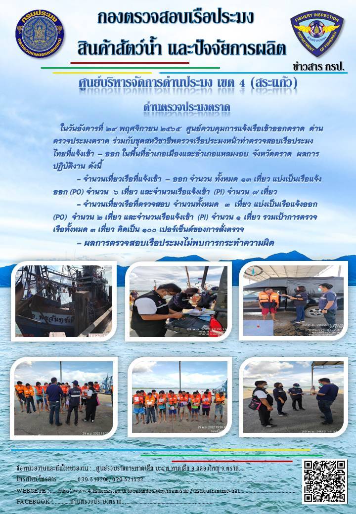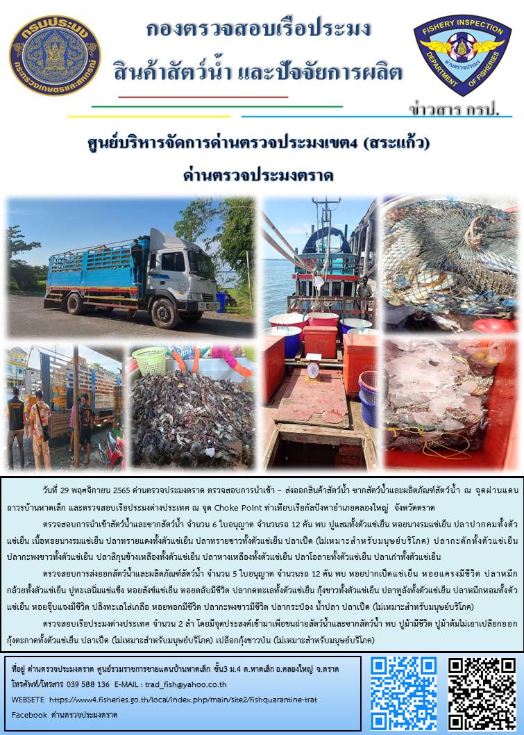รายละเอียด 1. ส่วนงานควบคุมการนำเข้า - ส่งออกสัตว์น้ำ ซากสัตว์น้ำ และผลิตภัณฑ์สัตว์น้ำ                  สถานที่ตั้งและที่อยู่ : ศูนย์รวมราชการชายแดนบ้านหาดเล็ก ชั้น3 หมู่ 4 ตำบลหาดเล็ก อำเภอคลองใหญ่ จังหวัตราด 23110              โทรศัพท์/โทรสาร : (039)588136              E-MAIL : trad_fish@yahoo.co.th   2. ส่วนงานควบคุมการแจ้งเรือเข้าออกตราด และ ส่วนงานอำนวยการ             สถานที่ตั้งและที่อยู่ : 34 หมู่ 8 ตำบลวังกระแจะ อำเภอเมือง จังหวัดตราด 23000             โทรศัพท์/โทรสาร : (039)521533 , 096-138-0520             E-MAIL : TRAT Fishery Inspection@fisheries.go.th   3. ส่วนงานควบคุมการแจ้งเรือเข้าออกคลองใหญ่             สถานที่ตั้งและที่อยู่ : ท่าเทียบเรือกัลปังหา เลขที่ 86 ถนนเทศบาล 1 ตำบลหาดเล็ก อำเภอคลองใหญ่ จังหวัดตราด 23110             โทรศัพท์/โทรสาร : (039)510296             E-MAIL : pipoklongyai@gmail.com  email  trad_fish@yahoo.co.th  โทรศัพท์ (039)588136 , (039)521533 , (039)510296  FAX (039)588136 , (039)521533 , (039)510296  แฟนเพจ แฟนเพจ