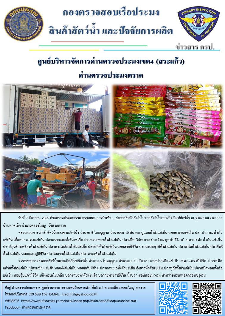 รายละเอียด 1. ส่วนงานควบคุมการนำเข้า - ส่งออกสัตว์น้ำ ซากสัตว์น้ำ และผลิตภัณฑ์สัตว์น้ำ                  สถานที่ตั้งและที่อยู่ : ศูนย์รวมราชการชายแดนบ้านหาดเล็ก ชั้น3 หมู่ 4 ตำบลหาดเล็ก อำเภอคลองใหญ่ จังหวัตราด 23110              โทรศัพท์/โทรสาร : (039)588136              E-MAIL : trad_fish@yahoo.co.th   2. ส่วนงานควบคุมการแจ้งเรือเข้าออกตราด และ ส่วนงานอำนวยการ             สถานที่ตั้งและที่อยู่ : 34 หมู่ 8 ตำบลวังกระแจะ อำเภอเมือง จังหวัดตราด 23000             โทรศัพท์/โทรสาร : (039)521533 , 096-138-0520             E-MAIL : TRAT Fishery Inspection@fisheries.go.th   3. ส่วนงานควบคุมการแจ้งเรือเข้าออกคลองใหญ่             สถานที่ตั้งและที่อยู่ : ท่าเทียบเรือกัลปังหา เลขที่ 86 ถนนเทศบาล 1 ตำบลหาดเล็ก อำเภอคลองใหญ่ จังหวัดตราด 23110             โทรศัพท์/โทรสาร : (039)510296             E-MAIL : pipoklongyai@gmail.com  email  trad_fish@yahoo.co.th  โทรศัพท์ (039)588136 , (039)521533 , (039)510296  FAX (039)588136 , (039)521533 , (039)510296  แฟนเพจ แฟนเพจ