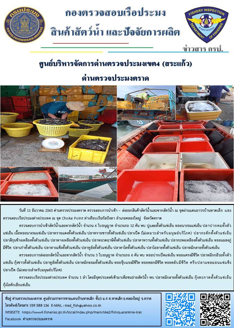 รายละเอียด 1. ส่วนงานควบคุมการนำเข้า - ส่งออกสัตว์น้ำ ซากสัตว์น้ำ และผลิตภัณฑ์สัตว์น้ำ                  สถานที่ตั้งและที่อยู่ : ศูนย์รวมราชการชายแดนบ้านหาดเล็ก ชั้น3 หมู่ 4 ตำบลหาดเล็ก อำเภอคลองใหญ่ จังหวัตราด 23110              โทรศัพท์/โทรสาร : (039)588136              E-MAIL : trad_fish@yahoo.co.th   2. ส่วนงานควบคุมการแจ้งเรือเข้าออกตราด และ ส่วนงานอำนวยการ             สถานที่ตั้งและที่อยู่ : 34 หมู่ 8 ตำบลวังกระแจะ อำเภอเมือง จังหวัดตราด 23000             โทรศัพท์/โทรสาร : (039)521533 , 096-138-0520             E-MAIL : TRAT Fishery Inspection@fisheries.go.th   3. ส่วนงานควบคุมการแจ้งเรือเข้าออกคลองใหญ่             สถานที่ตั้งและที่อยู่ : ท่าเทียบเรือกัลปังหา เลขที่ 86 ถนนเทศบาล 1 ตำบลหาดเล็ก อำเภอคลองใหญ่ จังหวัดตราด 23110             โทรศัพท์/โทรสาร : (039)510296             E-MAIL : pipoklongyai@gmail.com  email  trad_fish@yahoo.co.th  โทรศัพท์ (039)588136 , (039)521533 , (039)510296  FAX (039)588136 , (039)521533 , (039)510296  แฟนเพจ แฟนเพจ