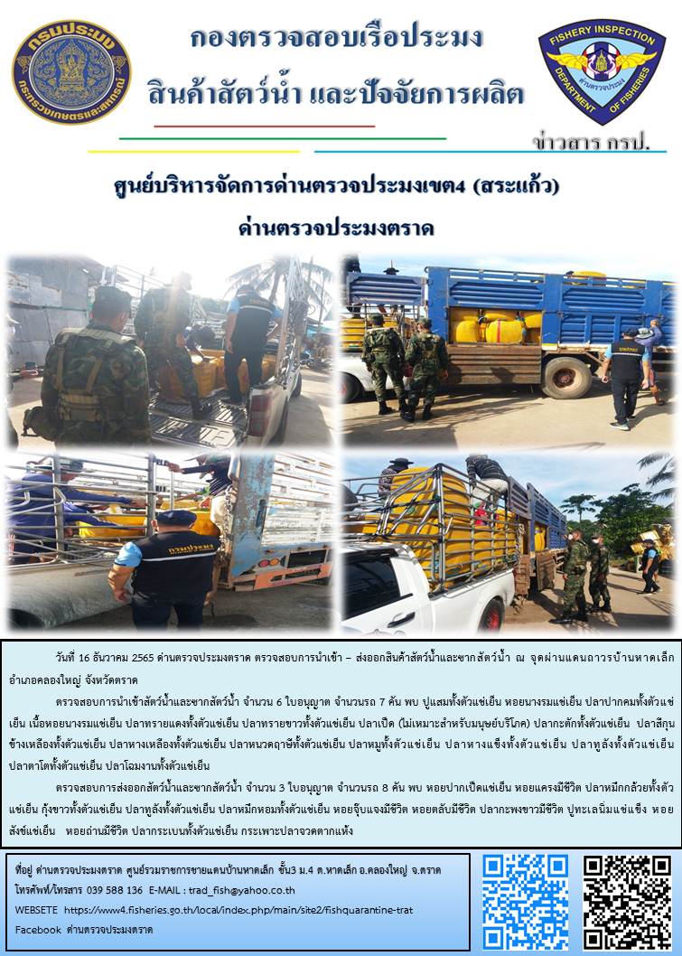 รายละเอียด 1. ส่วนงานควบคุมการนำเข้า - ส่งออกสัตว์น้ำ ซากสัตว์น้ำ และผลิตภัณฑ์สัตว์น้ำ                  สถานที่ตั้งและที่อยู่ : ศูนย์รวมราชการชายแดนบ้านหาดเล็ก ชั้น3 หมู่ 4 ตำบลหาดเล็ก อำเภอคลองใหญ่ จังหวัตราด 23110              โทรศัพท์/โทรสาร : (039)588136              E-MAIL : trad_fish@yahoo.co.th   2. ส่วนงานควบคุมการแจ้งเรือเข้าออกตราด และ ส่วนงานอำนวยการ             สถานที่ตั้งและที่อยู่ : 34 หมู่ 8 ตำบลวังกระแจะ อำเภอเมือง จังหวัดตราด 23000             โทรศัพท์/โทรสาร : (039)521533 , 096-138-0520             E-MAIL : TRAT Fishery Inspection@fisheries.go.th   3. ส่วนงานควบคุมการแจ้งเรือเข้าออกคลองใหญ่             สถานที่ตั้งและที่อยู่ : ท่าเทียบเรือกัลปังหา เลขที่ 86 ถนนเทศบาล 1 ตำบลหาดเล็ก อำเภอคลองใหญ่ จังหวัดตราด 23110             โทรศัพท์/โทรสาร : (039)510296             E-MAIL : pipoklongyai@gmail.com  email  trad_fish@yahoo.co.th  โทรศัพท์ (039)588136 , (039)521533 , (039)510296  FAX (039)588136 , (039)521533 , (039)510296  แฟนเพจ แฟนเพจ