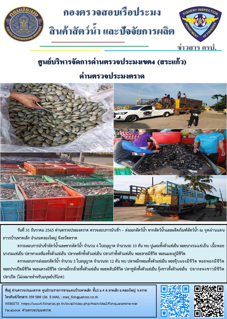• ด่านตรวจประมงตราด เข้าร่วมกิจกรรมเก็บขยะชายหาดเฉลิมพระเกียรติ สมเด็จพระเจ้าลูกเธอ เจ้าฟ้าาสิริวัณณวรี นารีรัตนราชกัญญา เนื่องในโอกาสวันคล้ายวันประสูติ 8 มกราคม 2568 ด่านตรวจประมงตราด เข้าร่วมกิจกรรมเก็บขยะชายหาดเฉลิมพระเกียรติ สมเด็จพระเจ้าลูกเธ... จำนวนผู้อ่าน 67  ผลการปฏิบัติงานของด่านตรวจประมงตราด ประจำวันที่ 12 มิถุนายน 2568  ผลการปฏิบัติงานของด่านตรวจประมงตราด ประจำวันที่ 12 มิถุนายน 2568   จำนวนผู้อ่าน 61 ประกาศคณะกรรมการขายทอดตลาดเรือประมง สำนักงานประมงจังหวัดตราด เรื่องขายทอดตลาดเรือประมง (ของกลาง) ประกาศคณะกรรมการขายทอดตลาดเรือประมง สำนักงานประมงจังหวัดตราด เรื่องขายทอดตลาดเรื... จำนวนผู้อ่าน 59 ผลการปฏิบัติงานของด่านตรวจประมงตราด ประจำวันที่ 6 มิถุนายน 2568  ผลการปฏิบัติงานของด่านตรวจประมงตราด ประจำวันที่ 6 มิถุนายน 2568   จำนวนผู้อ่าน 52 ผลการปฏิบัติงานของด่านตรวจประมงตราด ประจำวันที่ 6 พฤษภาคม 2568  ผลการปฏิบัติงานของด่านตรวจประมงตราด ประจำวันที่ 6 พฤษภาคม 2568   จำนวนผู้อ่าน 50 รายงานการนำเข้า-ส่งออกสัตว์น้ำ ซากสัตว์น้ำและผลิตภัณฑ์สัตว์น้ำ และเรือประมงต่างประเทศที่เข้าเทียบท่าผ่านทางด่านตรวจประมงตราด ประจำเดือน มีนาคม 2568 รายงานการนำเข้า-ส่งออกสัตว์น้ำ ซากสัตว์น้ำและผลิตภัณฑ์สัตว์น้ำ และเรือประมงต่างป... จำนวนผู้อ่าน 48 ผลการปฏิบัติงานของด่านตรวจประมงตราด ประจำวันที่ 10 มิถุนายน 2568  ผลการปฏิบัติงานของด่านตรวจประมงตราด ประจำวันที่ 10 มิถุนายน 2568   จำนวนผู้อ่าน 46 ด่านตรวจประมงตราด ร่วมพิธีปล่อยพันธ์ุสัตว์น้ำ เนื่องในโอกาสวันเฉลิมพระชนมพรรษา สมเด็จพระนางเจ้าสิริกิติ์ พระบรมราชินีนาถ พระบรมราชชนนีพันปีหลวง ด่านตรวจประมงตราด ร่วมพิธีปล่อยพันธ์ุสัตว์น้ำ เนื่องในโอกาสวันเฉลิมพระชนมพรรษา ส... จำนวนผู้อ่าน 46 ผลการปฏิบัติงานของด่านตรวจประมงตราด ประจำวันที่ 27 เมษายน 2568  ผลการปฏิบัติงานของด่านตรวจประมงตราด ประจำวันที่ 27 เมษายน 2568   จำนวนผู้อ่าน 45 โครงการประมงรวมใจ จ่ายระบบติดตามเรือประมง (VMS) คนละครึ่ง โครงการประมงรวมใจ จ่ายระบบติดตามเรือประมง (VMS) คนละครึ่ง  จำนวนผู้อ่าน 45 ผลการปฏิบัติงานของด่านตรวจประมงตราด ประจำวันที่ 16 มิถุนายน 2568  ผลการปฏิบัติงานของด่านตรวจประมงตราด ประจำวันที่ 16 มิถุนายน 2568   จำนวนผู้อ่าน 44 ผลการปฏิบัติงานของด่านตรวจประมงตราด ประจำวันที่ 9 มิถุนายน 2568  ผลการปฏิบัติงานของด่านตรวจประมงตราด ประจำวันที่ 9 มิถุนายน 2568   จำนวนผู้อ่าน 34 ผลการปฏิบัติงานของด่านตรวจประมงตราด ประจำวันที่ 4 สิงหาคม 2568  ผลการปฏ